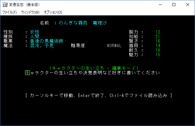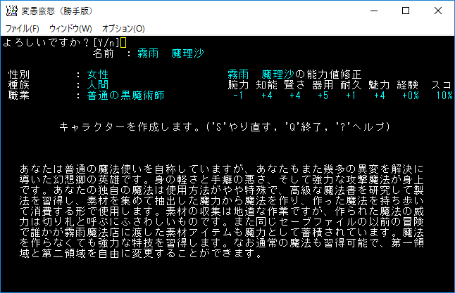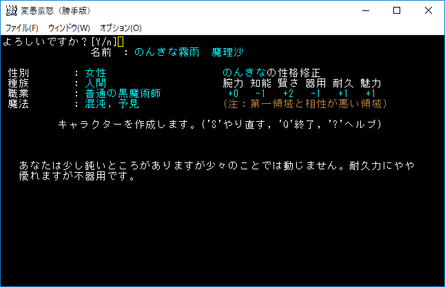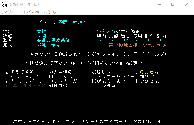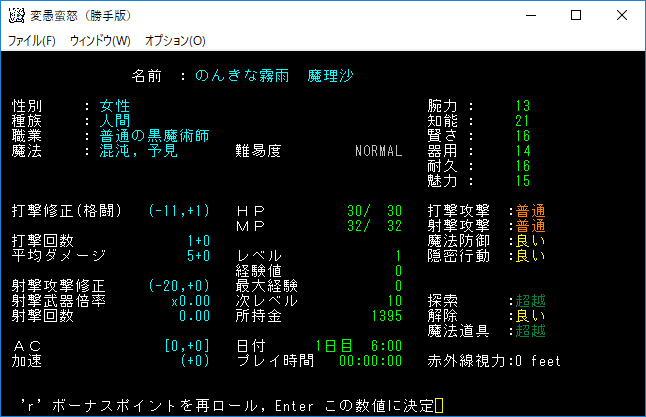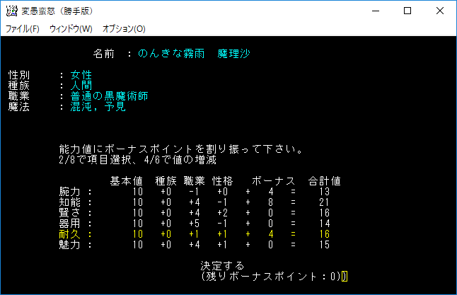 魔理沙の初期値は上の図になります、『r』ボタンを押せばボーナスポイントを吟味できるようです。私は1回作成し直した。