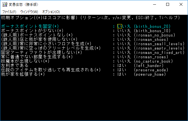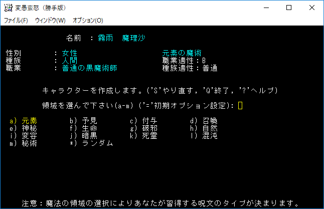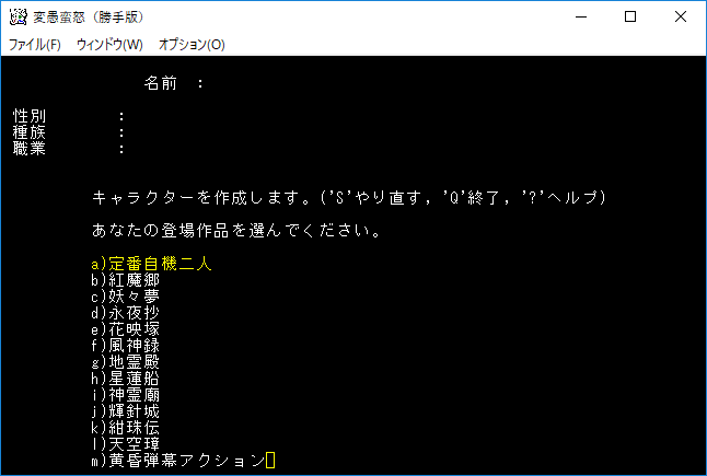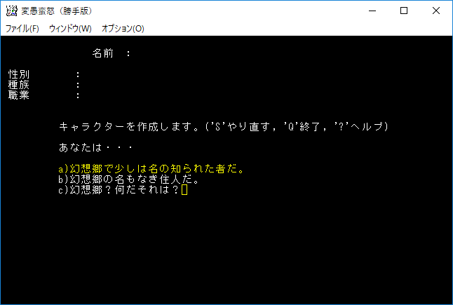 見たことのない選択肢が出てきました(上の図)。本家、変愚蛮怒とは全く違うキャラメイクになっていますね。(a)の『名の知られた者だ』を選びましょう。