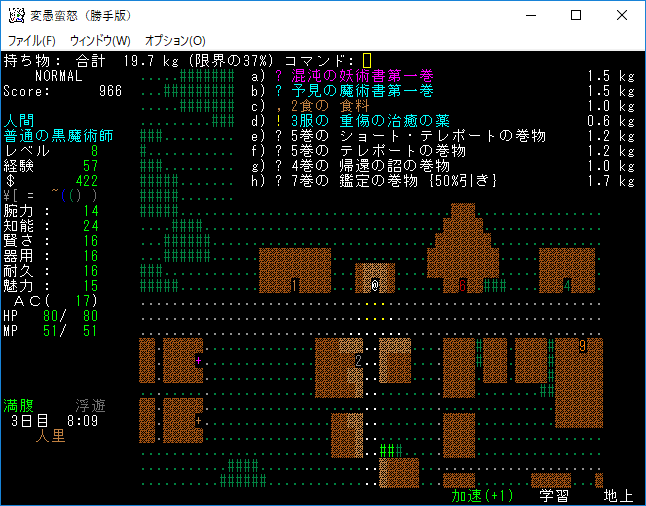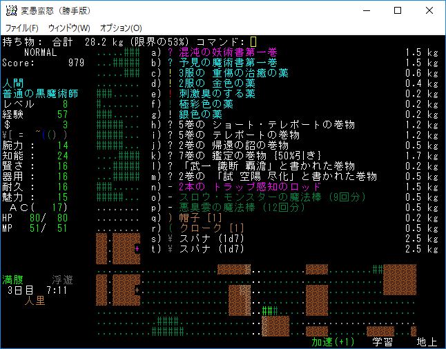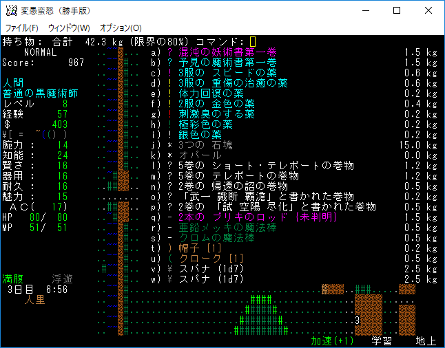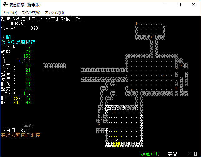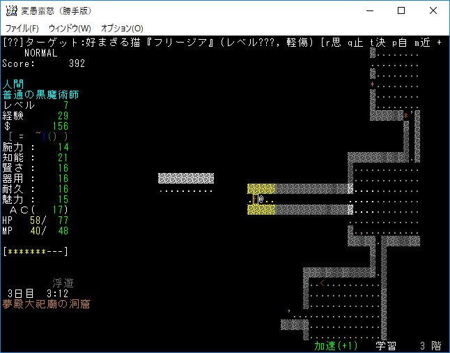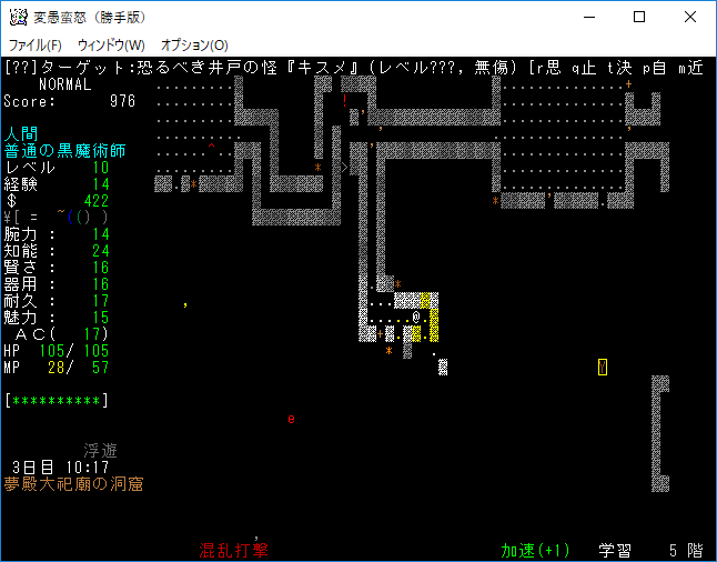 おはようございます。変愚蛮怒東方Project勝手版のプレイ日記を始めます。今回は夢殿⼤祀廟の地下6階くらいまで探索をします。アイテムを拾って鑑定(店に売る)をしたりランダムクエストに向けて魔理沙の強さを知りたい。