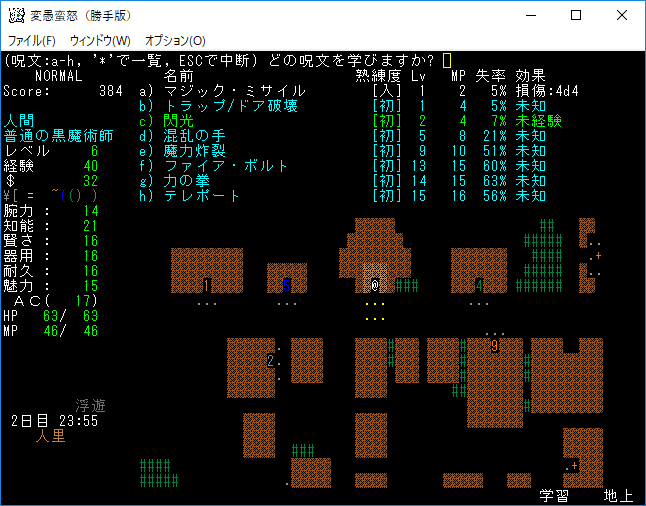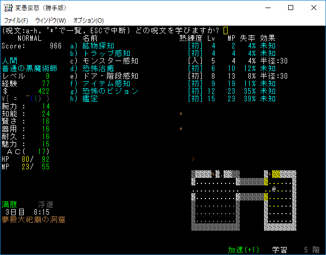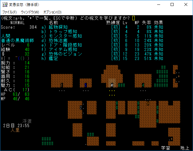 『ドア・階段感知』の魔法は便利です。このゲームをやってみれば分かるけど、階段を探したり隠し扉を見つけるのがめんどくさい(泣)。序盤にあると助かる魔法ですから学習をします。