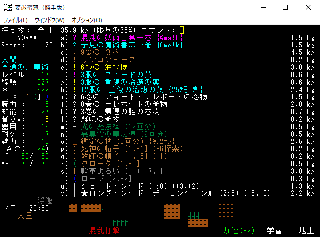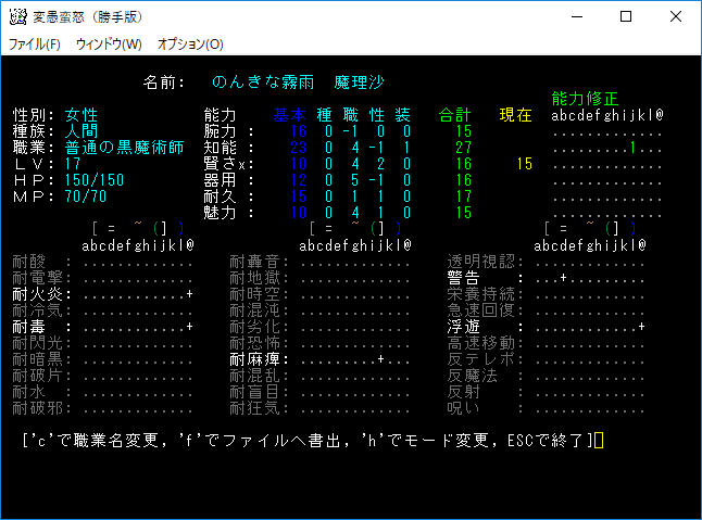 4時間くらい飛び続けて魔理沙が人里に戻りました。現在のアイテムを確認します。多くの耐性が埋まってくれたらオークのクエストに突っ込むかもしれない。