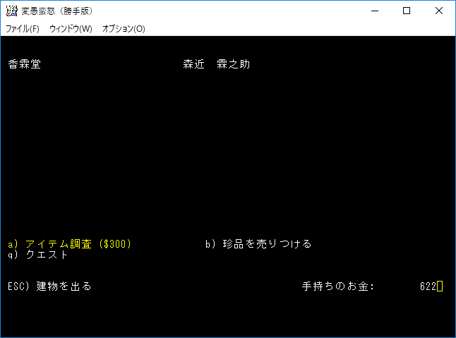 香霖堂の主は森近霖之助というのか。名前を見るに男子ですよね。どうやら300円で*鑑定*をしてくるみたい。本家、変愚蛮怒に比べると安いですねー!