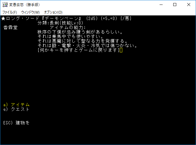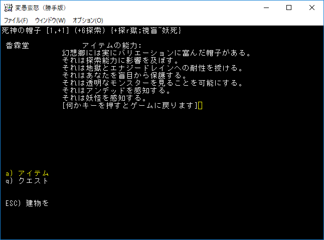 人里に『*鑑定*の巻物』は売っていなかった。*鑑定*できる施設もないみたい。*鑑定*とは装備品の真の性能を知ることなのです。どこで出来るのか調べてみたところ『香霖堂』という街なら可能みたいです。