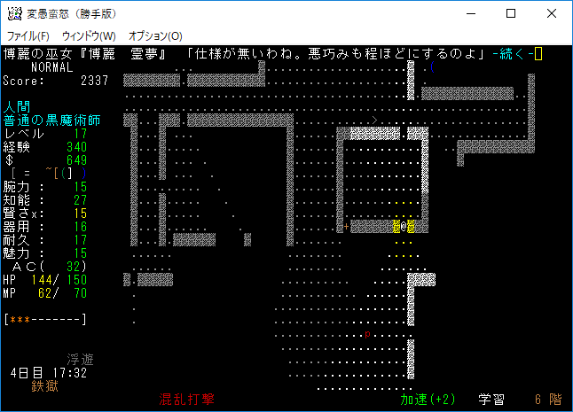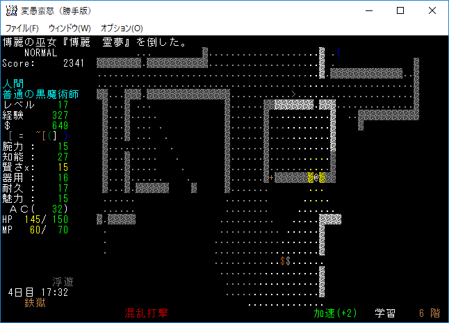 マジックミサイルを連打するだけで『トラのホッブス』を撃破することができました(笑)。うーむ、これだけ魔理沙が強ければ地下12階のランダムクエストも攻略できるなあ?