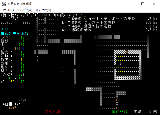 これ以上探索をしてもアイテムを持てないから無駄に終わります。さっさと街に戻ってアイテムを鑑定するのです。序盤ならばランダムクエストの報酬によりプレイヤーが大幅に強化されます(運が良ければ)。『帰還の詔の巻物』を呼んで地上に戻りますね。