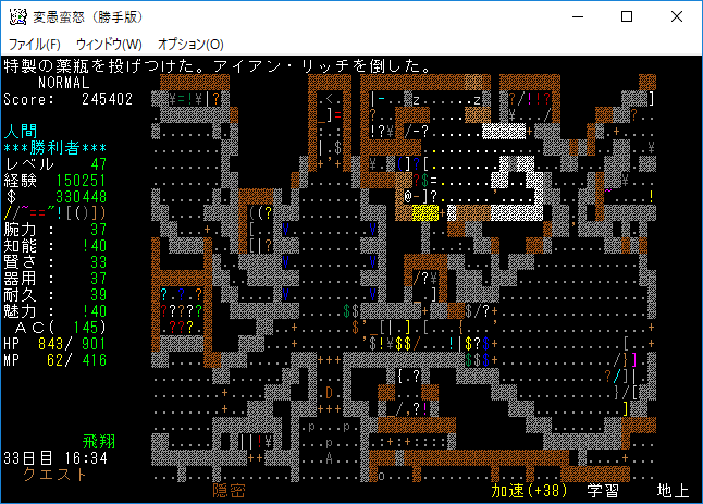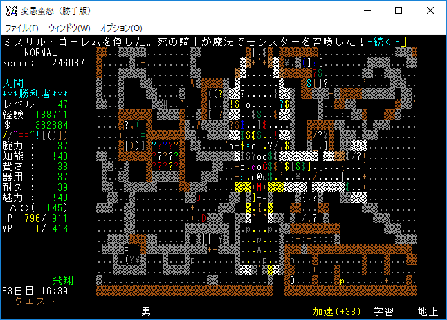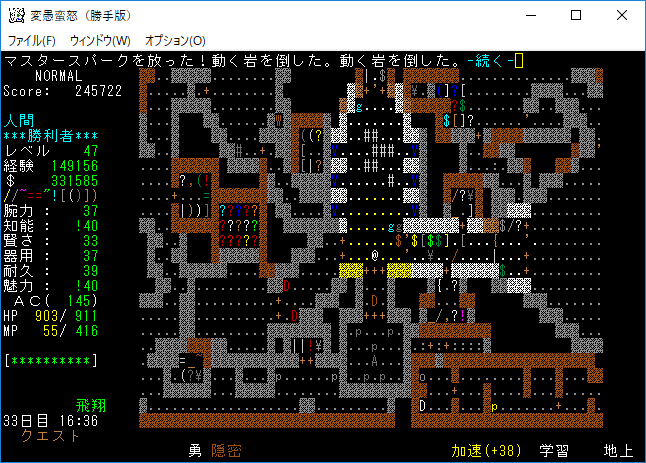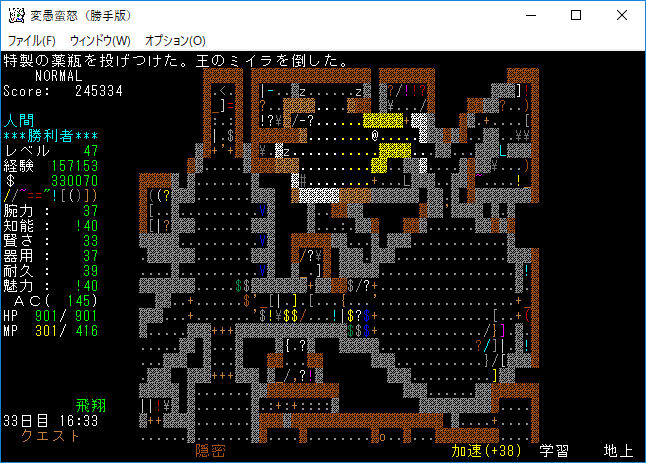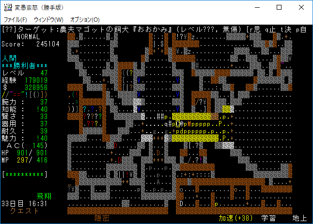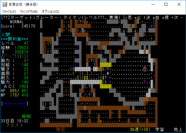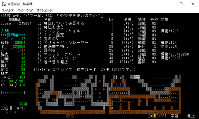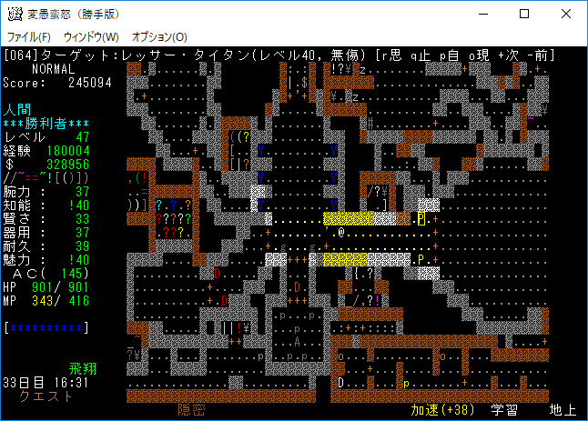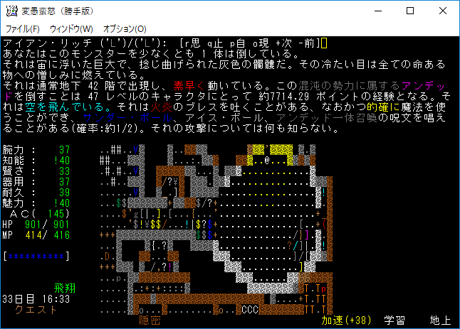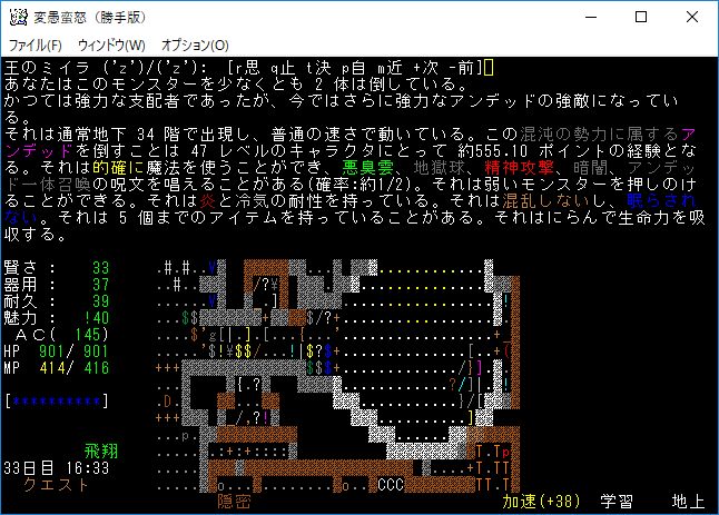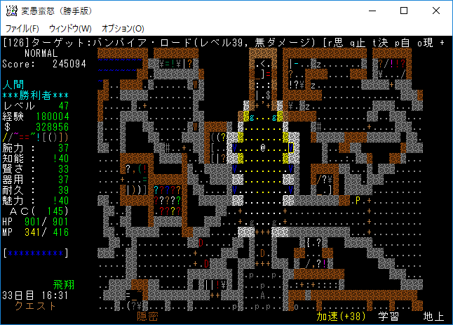 おはようございます。変愚蛮怒東方Project勝手版のプレイ日記を始めます。古い城クエストに挑戦中。まだクエストに入って啓蒙をしただけです。真下にいるマスター・バンパイアにイリュージョンレーザーを撃ってぶっ倒します。
