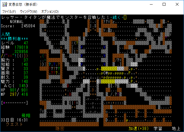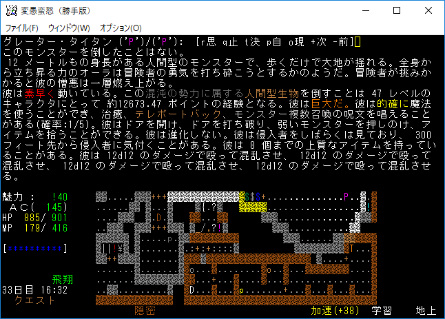 マスタースパークを撃ってレッサータイタンを瀕死にした。それは良いのだが、モンスター召喚の魔法を使われちゃったあ(泣)。『エリリル(警告あり)』が白く光ったぞ。召喚されたモンスターの中にユニークがいる!