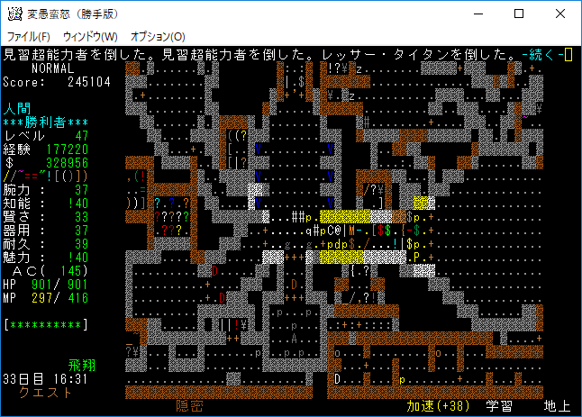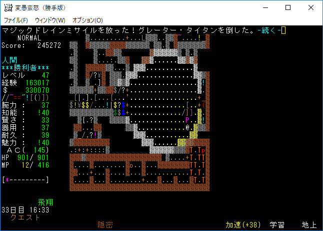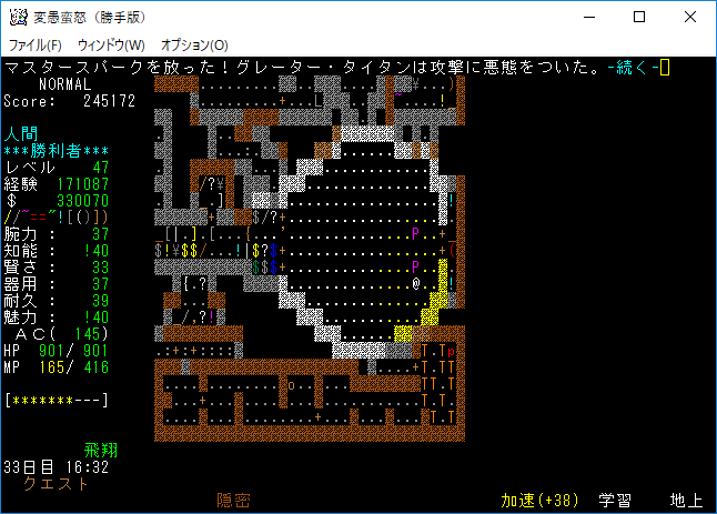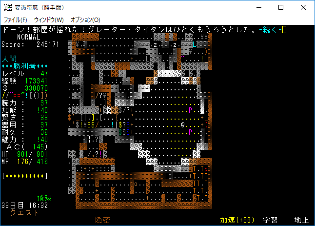 マスタースパークを連打してグレーター・タイタンを殲滅する。朦朧のおかげでグレーター・タイタンよりも楽だった。HP1000だからって舐めすぎた(泣)。