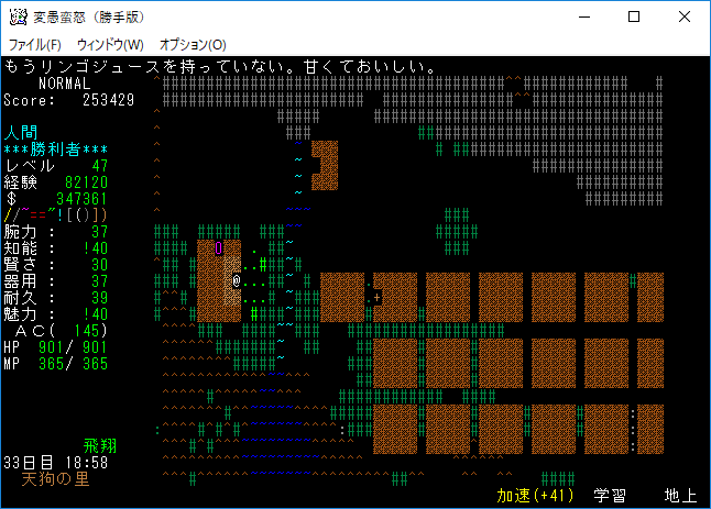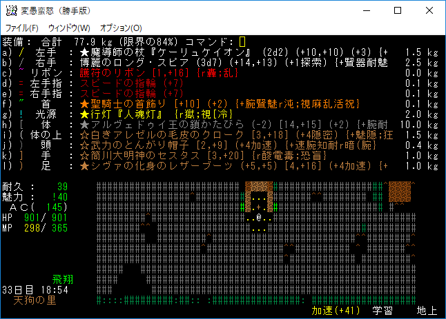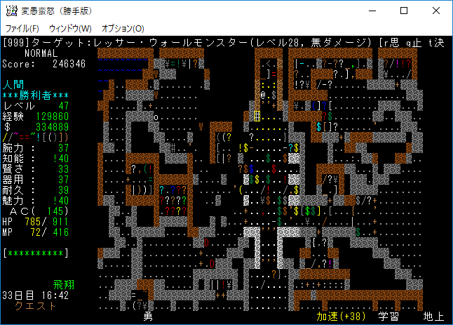 左上のフロアにはドラコリッチやトロルがおり一番攻略が楽でした。ほぼモンスターは倒し尽くしたのでラアルの破壊集大成がいる部屋を攻略します。こいつにはLOSトリックが効くんだっけ?200フィート、つまり20歩離れれば視覚外攻撃が可能になるのかな(不明)?