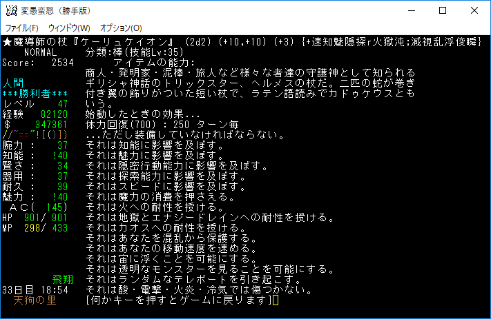 『ケーリュケイオン』のおかげで耐性パズルが可能になった。疲れたから装備は後で変更をします。警告が無くなったから★帯魔力ペンダントを装備しようかな。