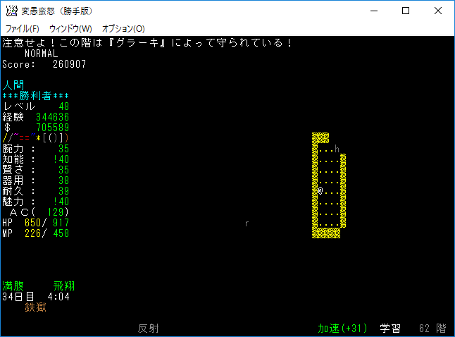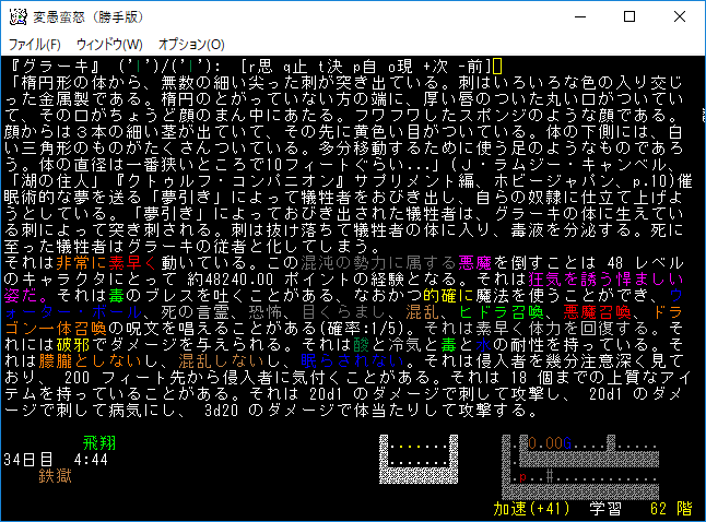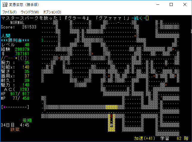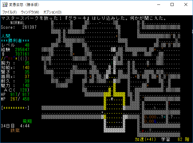 鉄獄62階に降りました。HPが減っているのは超人ロックのクローンに襲われたから。この階の主は『グラーキ』らしい。申し訳ないことに記憶に無いユニークだな(笑)。