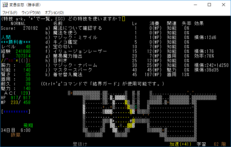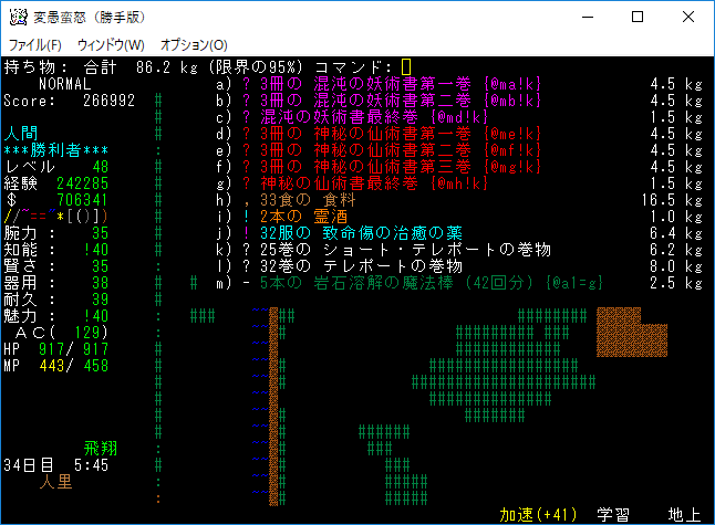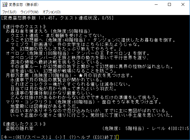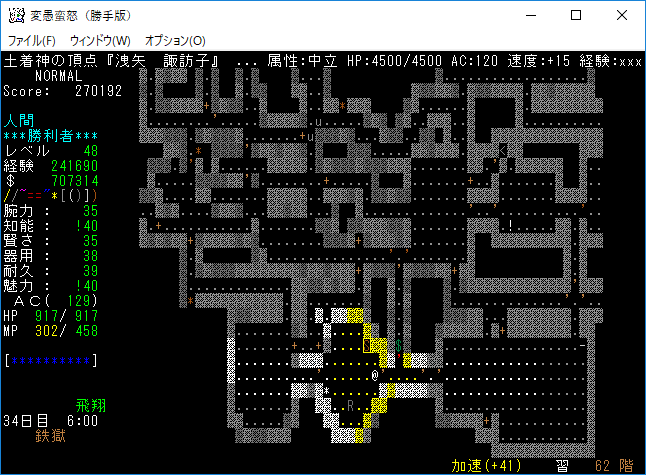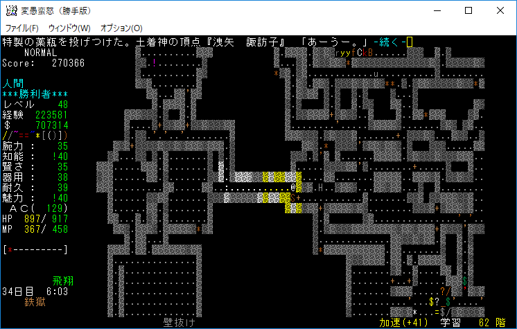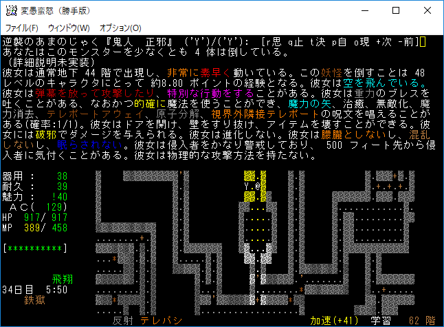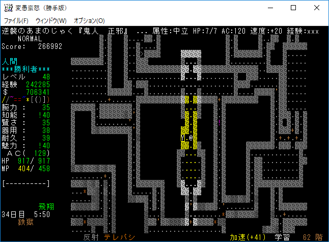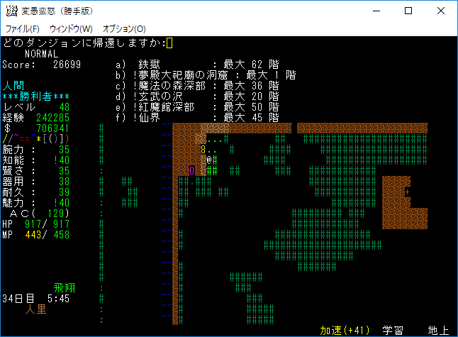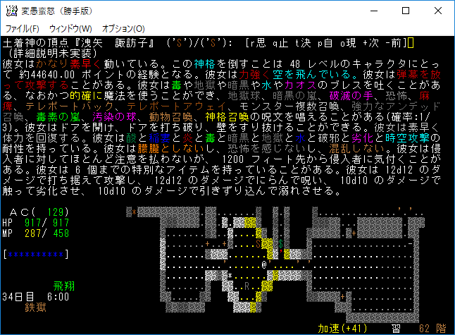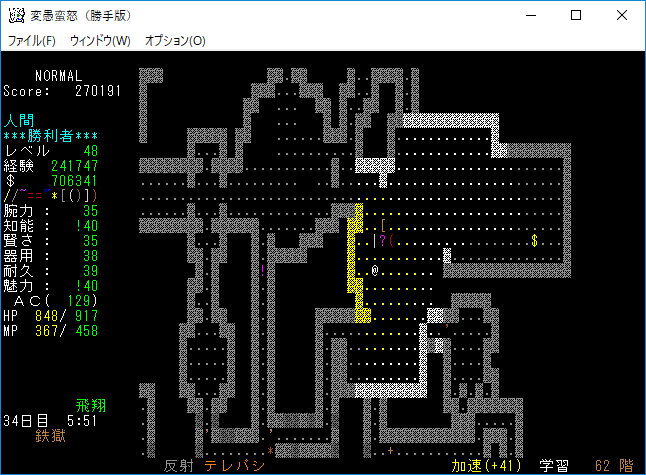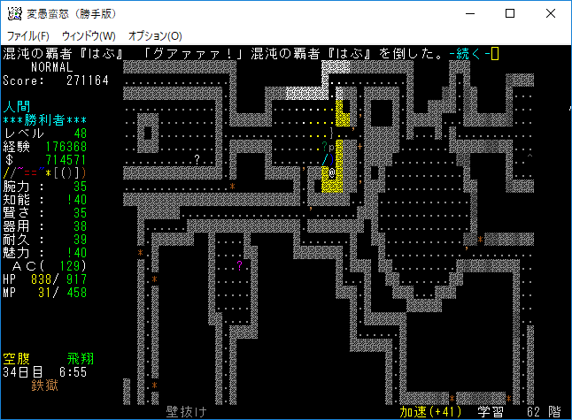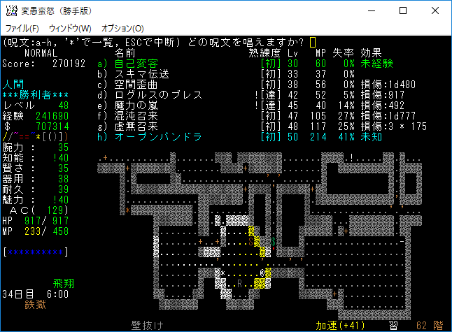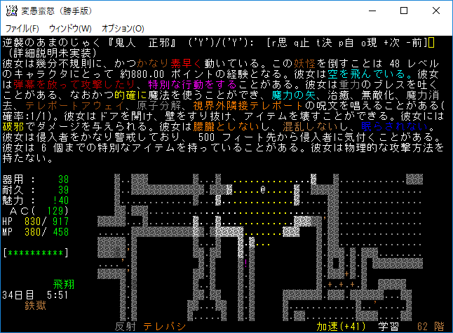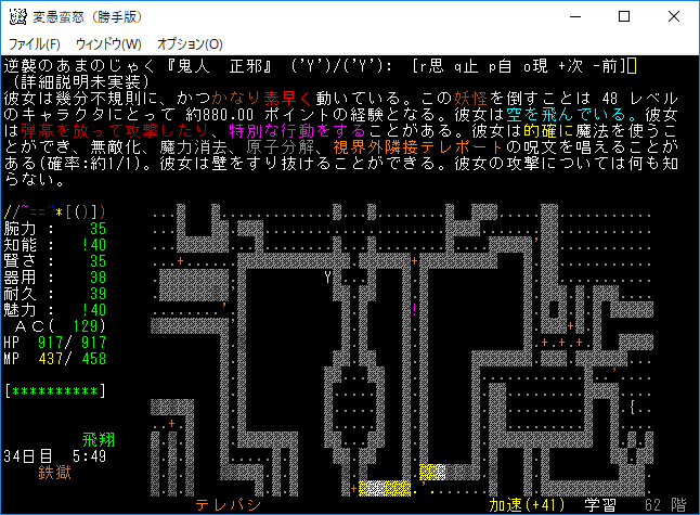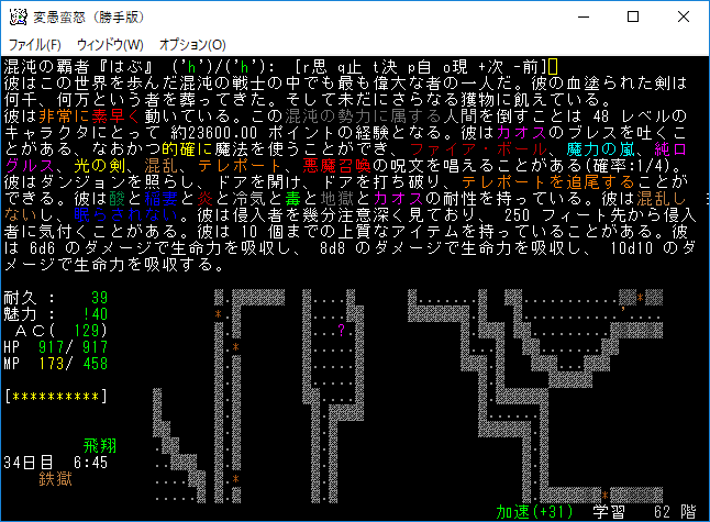 おはようございます。変愚蛮怒東方Project勝手版のプレイ日記を始めます。今回は鉄獄をひたすら潜ります。強力なアーティファクトを拾えたら嬉しいですね。