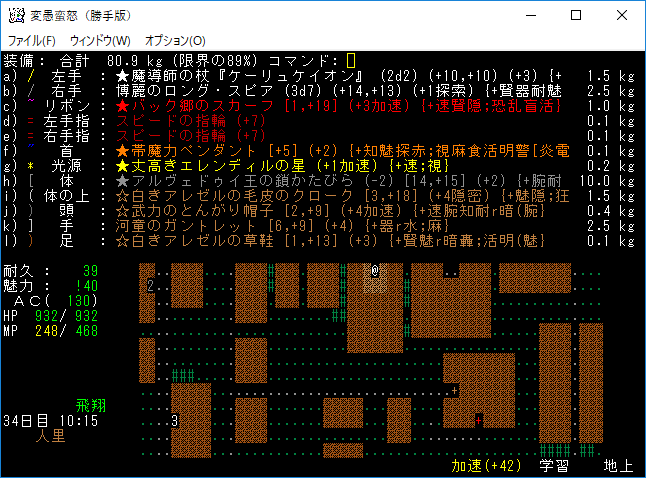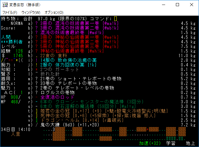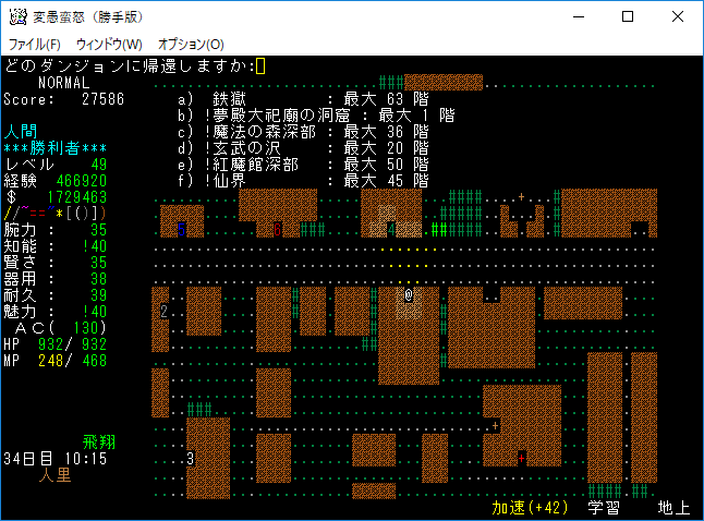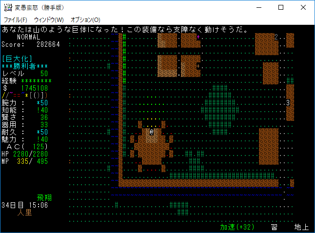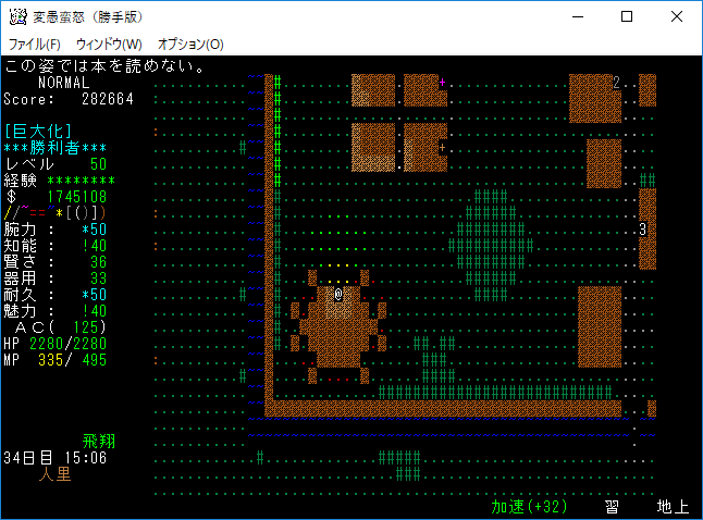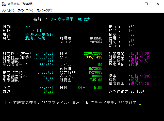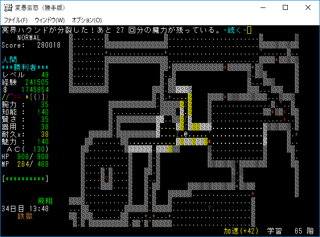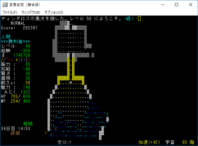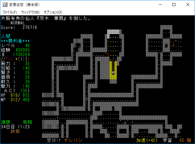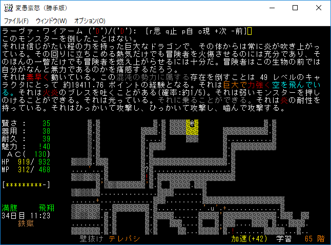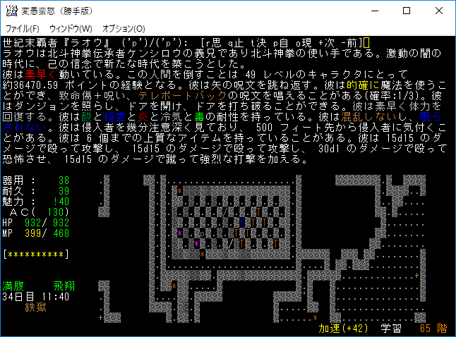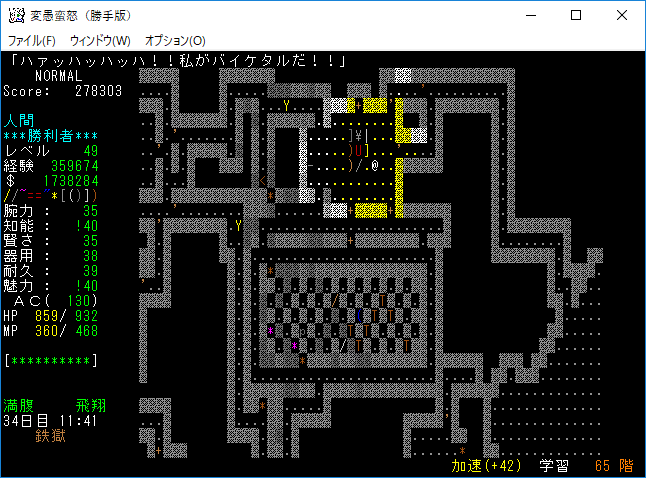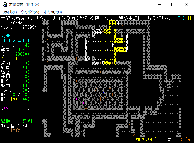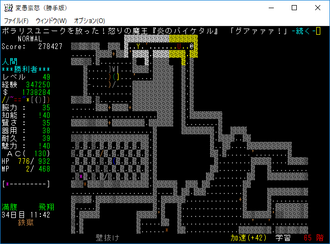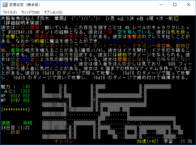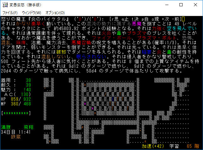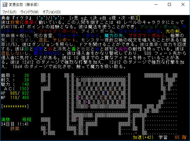 おはようございます。変愚蛮怒東方Project勝手版のプレイ日記を始めます。今回も鉄獄を探索しようか。難易度60階のクエストがあるけど勝手版オリジナルのクエストだから達成する自信がない。