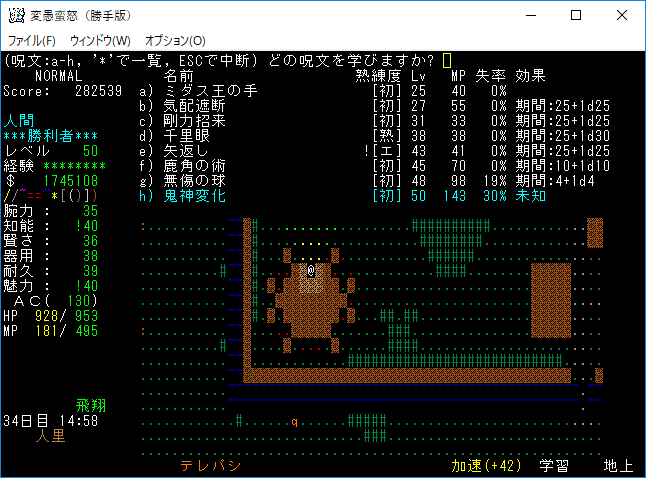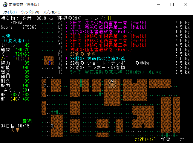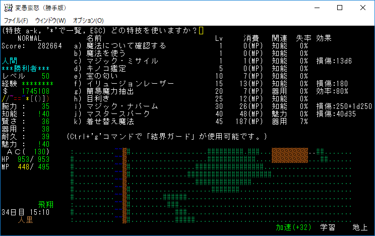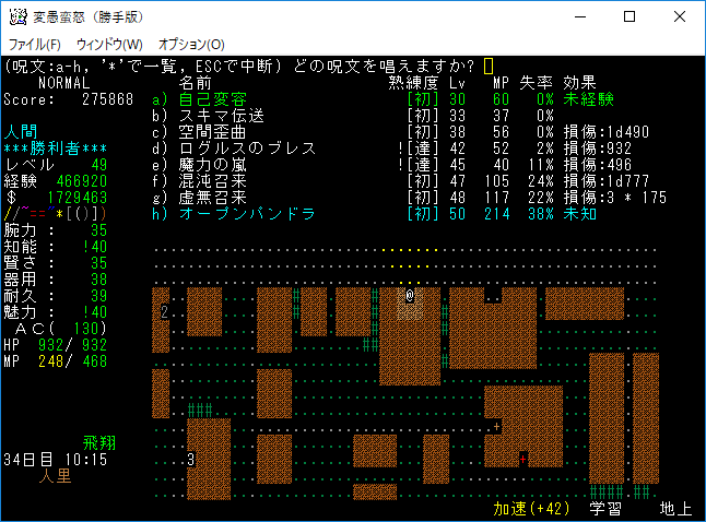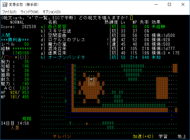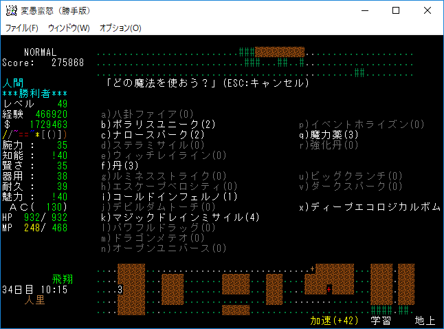 もう攻撃魔法よりも丹や魔力薬の方が重要になってしまった。たまにマジックドレインミサイルを生命体に撃つくらいです。全ての魔法書を揃えたら攻撃魔法にも出番はあると思うんだけど。
