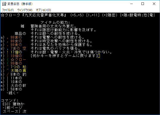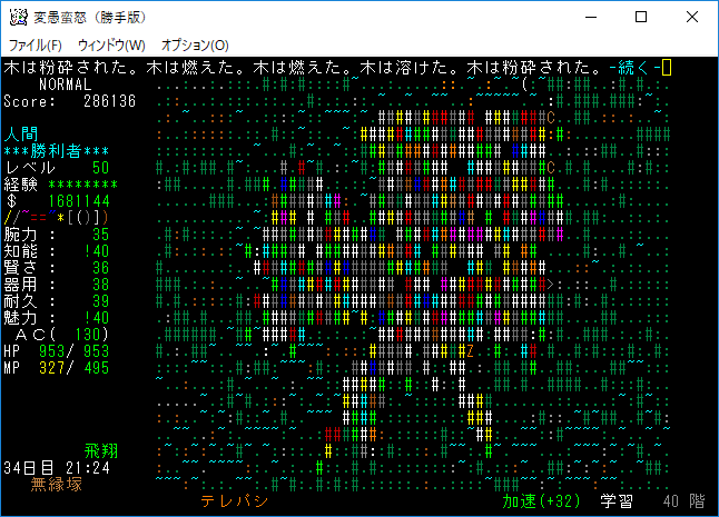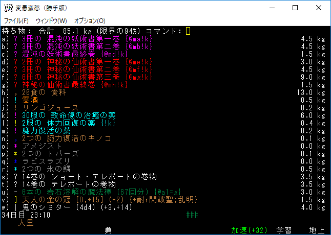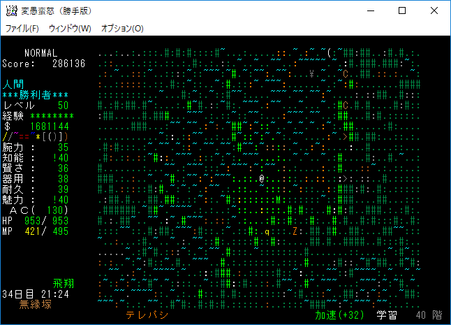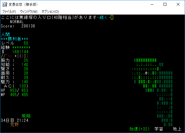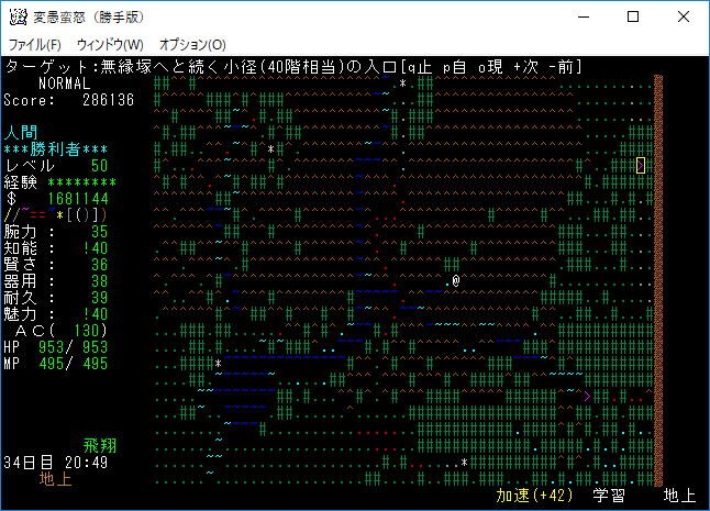 無縁塚の入り口を降りました。変愚ってダンジョンの入り口を降りた直後はロクなアイテムが落ちていないし、強い敵も出ない(たしか)。本格的に探索が始まるのは地下41階からかな。