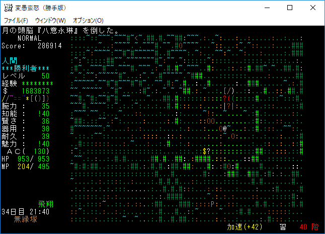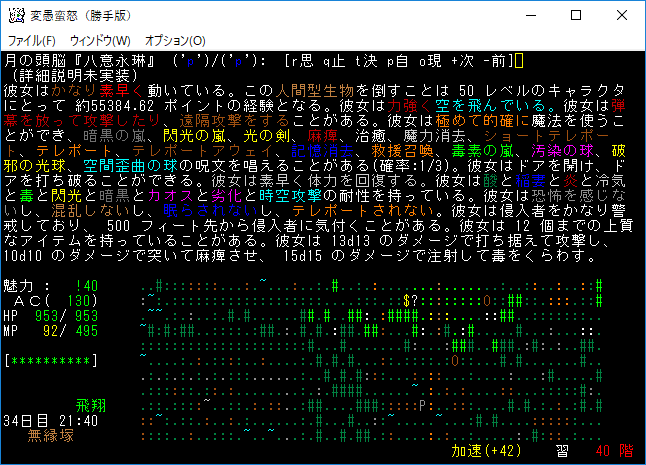 地下40階の雰囲気がやばいっす。vaultがあるのかと探していたら『八意永琳』と遭遇。こいつは強いな。魔力の嵐を連打します。