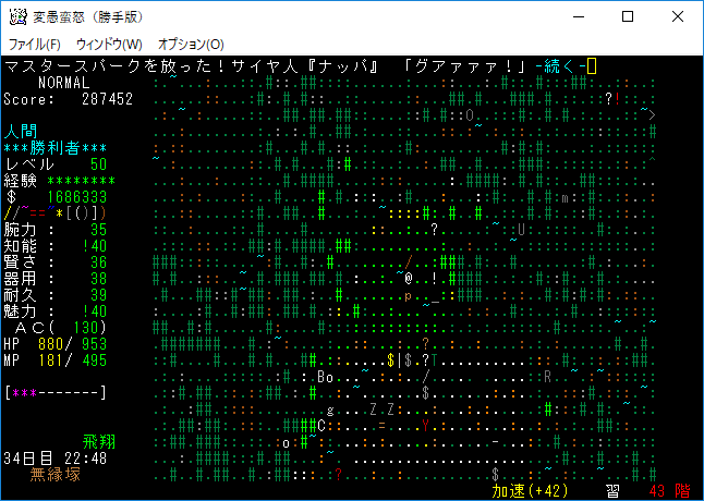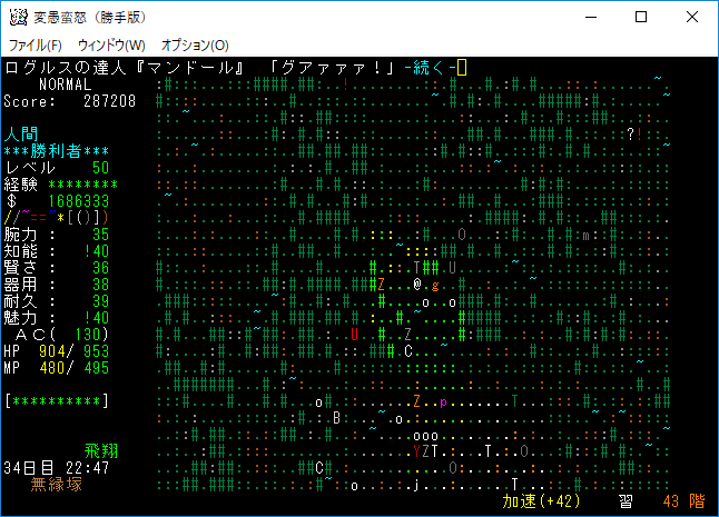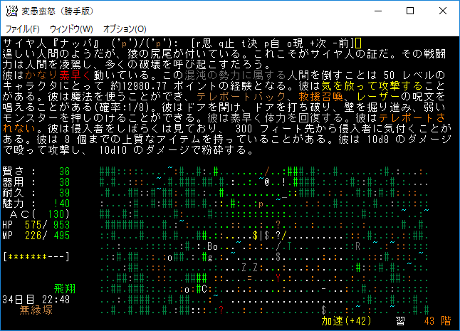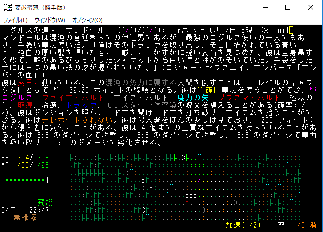 43階まで降りました。『マンドール』と遭遇をする。こいつの純ログルスをくらって種族が変わったりするよね。ハーフエルフでプレイをしていたらトロルに変化とか。