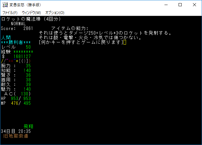 魔力薬を使いつつ『八意永琳』を撃破。倒した後に階層の雰囲気が普通になりました。このダンジョンは強いユニークが出やすいんだね。