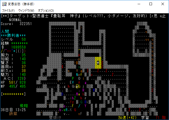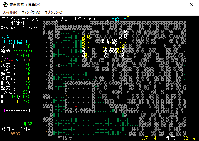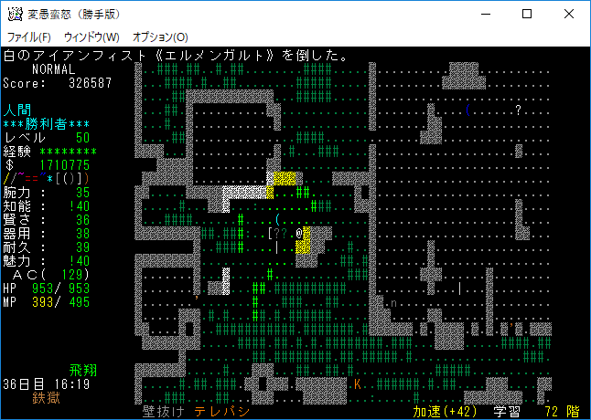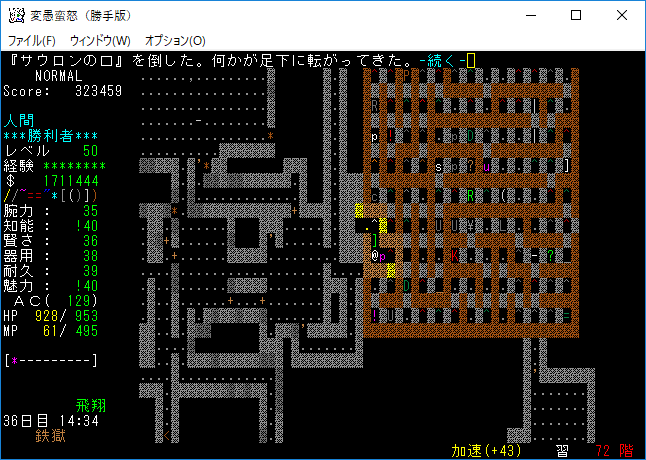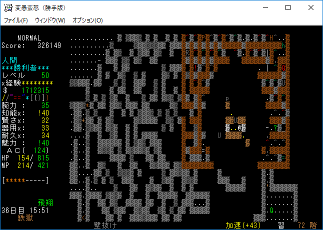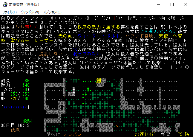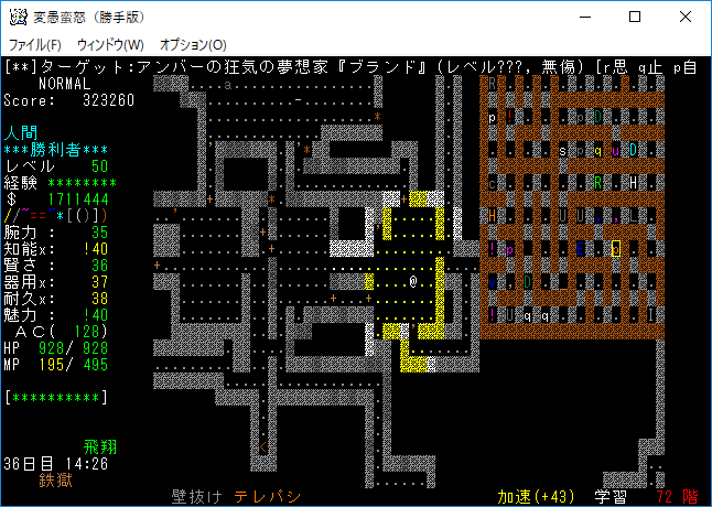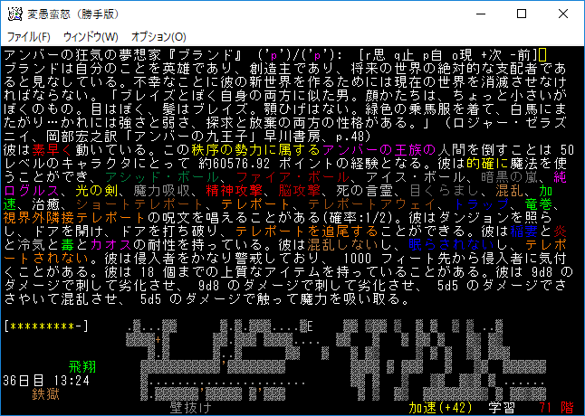 おはようございます。変愚蛮怒東方Project勝手版のプレイ日記を始めます。前回は『ブランド』を見つけたところで中断をしました。引き続き鉄獄の探索をします。