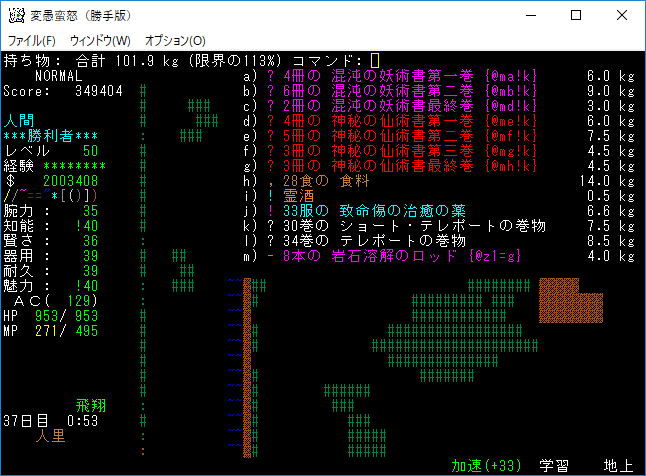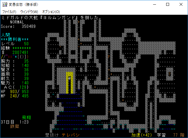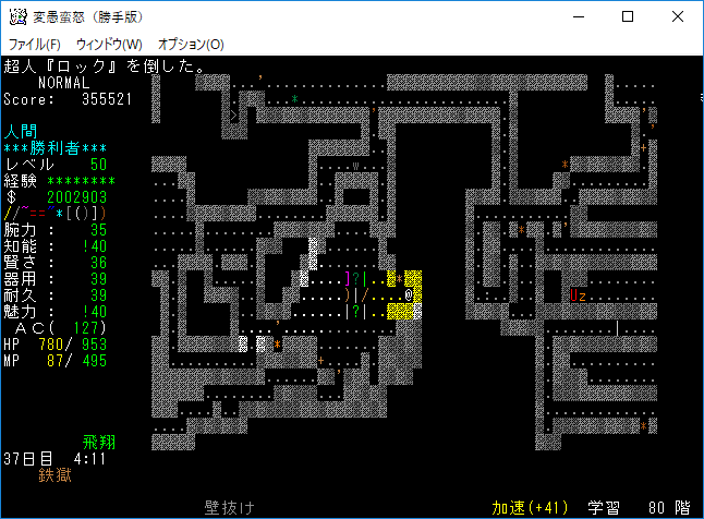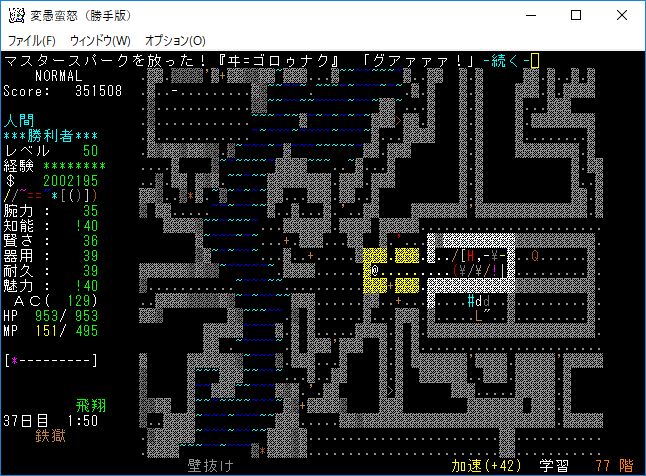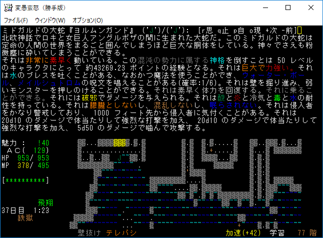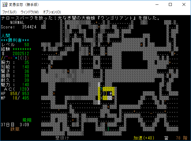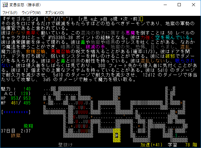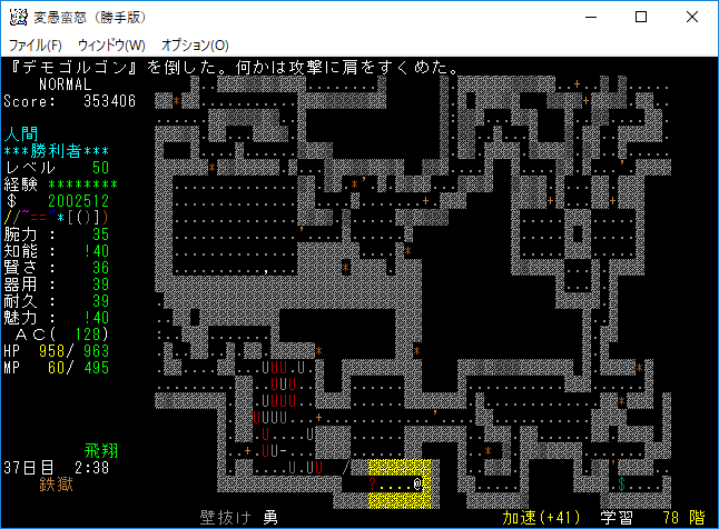 下手くそな穴熊を晒しつつ『デモゴルゴン』を撃破。ユニークモンスターと出会う頻度が減ってきました。あれだけぶっ倒してきたのだ。もう○馬とか超級のユニークしか残っていないのかも。