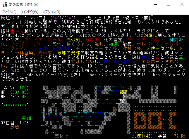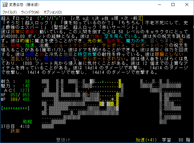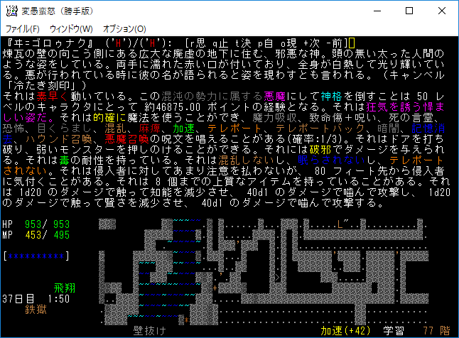 魔力薬でHPを回復しつつ『ヰ=ゴロゥナク』を撃破。最近出会うユニークは説明文からしてヤバい奴ばかりだ。モンスターの思い出を見るだけでも楽しいんだよなあ。