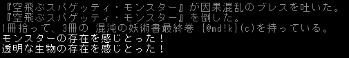テレポートで逃げまくるのを追いかけて『空飛ぶスパゲッティ・モンスター』を撃破。強い魔法を操る敵ではないが苦戦をした。ドロップをしたアイテムは混沌の妖術書最終巻です。
