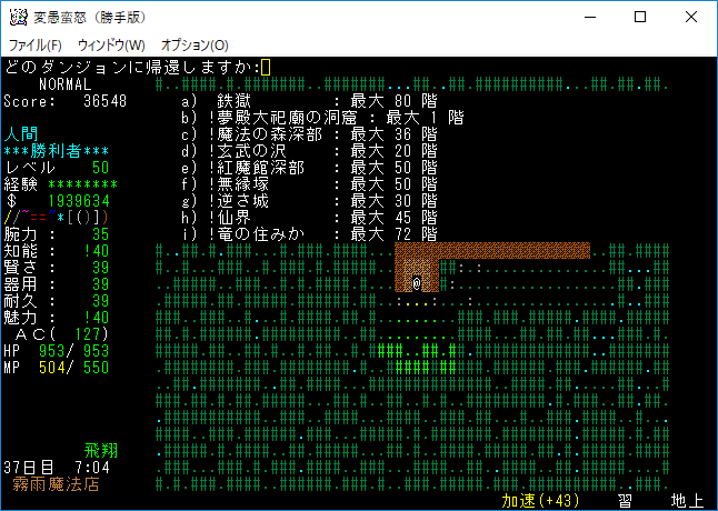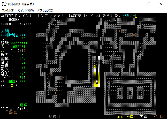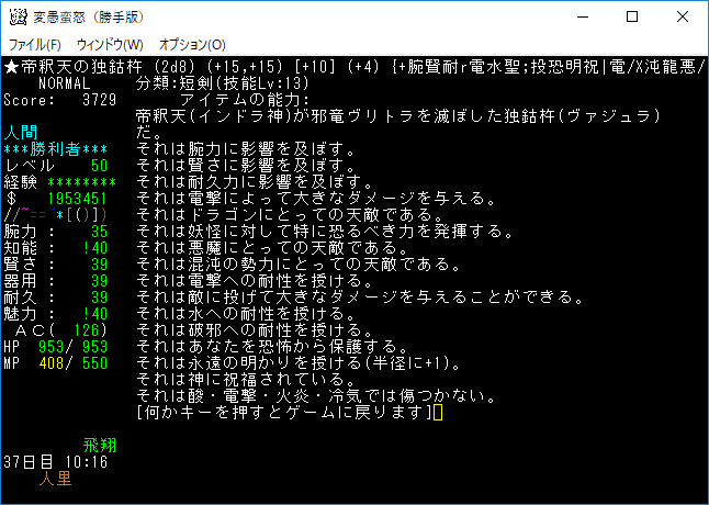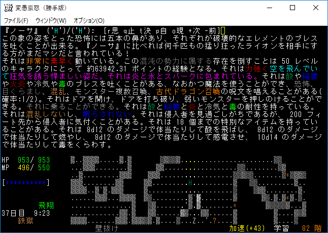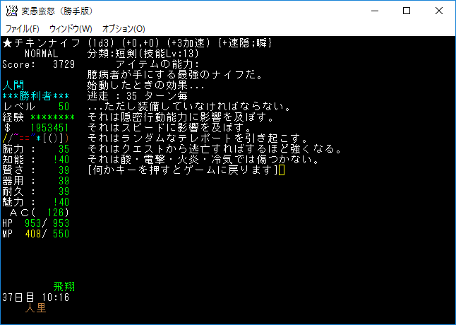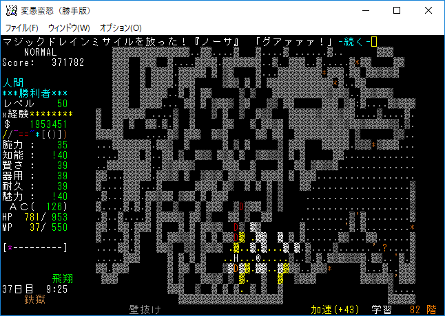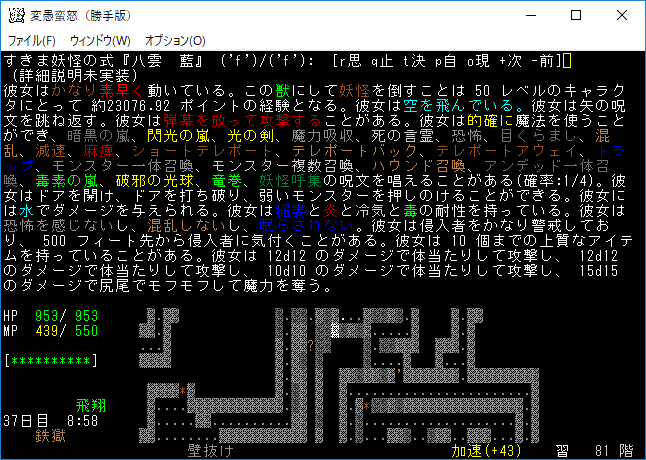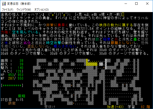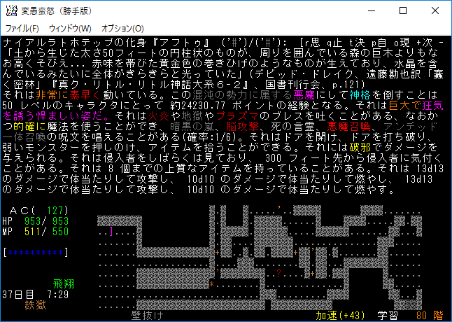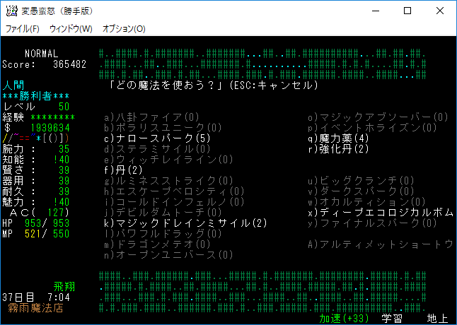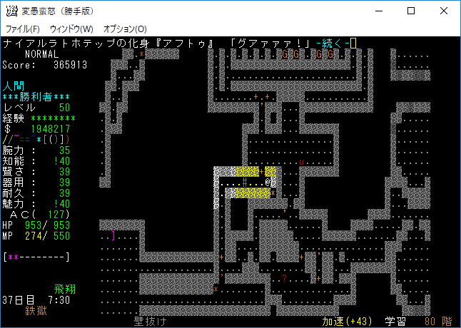 魔力の嵐を連打して『アフトゥ』を撃破。魔力の嵐は勝手版でも大活躍だ。変愚蛮怒はこれをマスターしたらほぼ*勝利*確定だろう(自分はそう思う)。