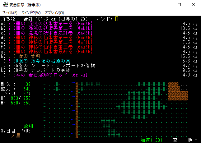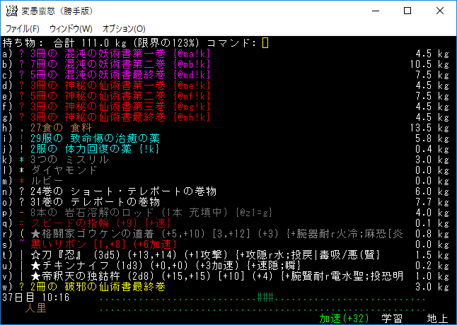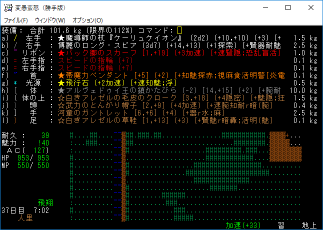 魔理沙はシヴァ靴を装備していません。よほど超級の靴を拾わないかぎりシヴァ靴が最終装備になるのにね。加速無しの足装備で探索するのはそんなに経験がありません。