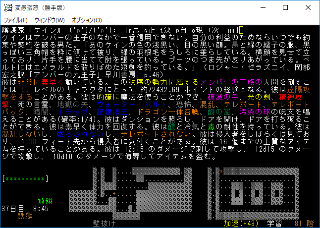 おはようございます。変愚蛮怒東方Project勝手版のプレイ日記を始めます。今回は鉄獄を探索しようか。次のランクエは地下88階だ。ランクエの手前まで潜りながらアンバーの王族を狩ろうぜ。