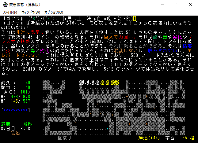 『ゴヂラ』はほんっと強かった(笑)。壁抜けをしてもガンガンHPを減らされてしまう。プラズマのブレスは凶悪です。壁抜けの無いクラスで遭遇をしたら即*破壊*します。