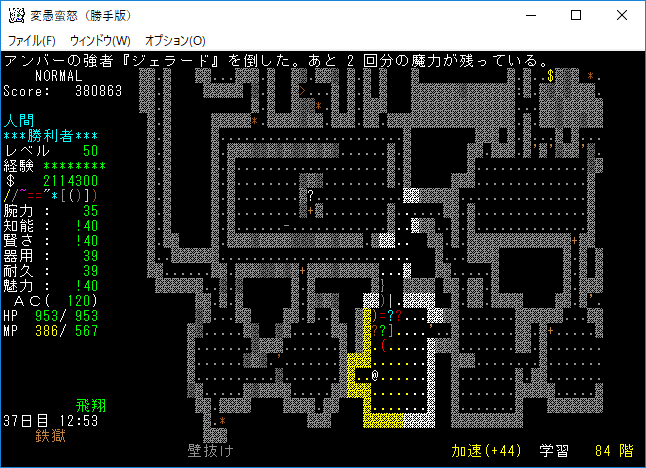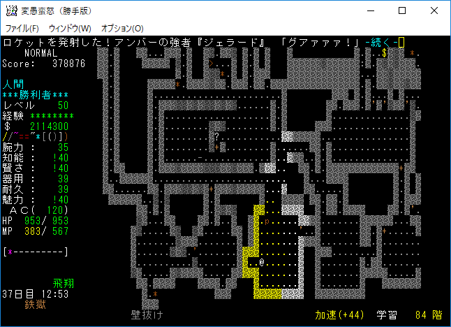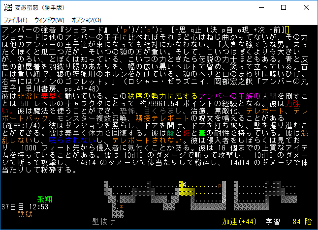 おはようございます。変愚蛮怒東方Project勝手版のプレイ日記を始めます。前回はアンバーの強者『ジェラード』と遭遇したところで中断。王族狩りを再開します。
