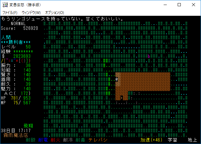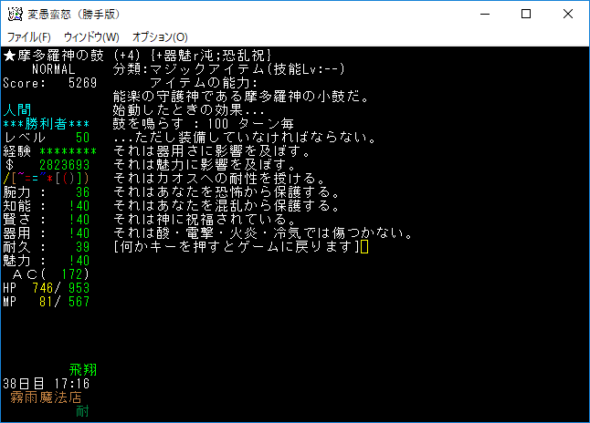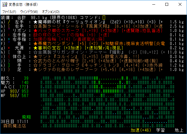 装備は前回と同じです。そういえば血の呪いで反魔のアミュレットが呪われるのを忘れていた。普通に餓死をしていたでしょう。不測の事態に備えて帰還のロッドは常備するべきなのだ。