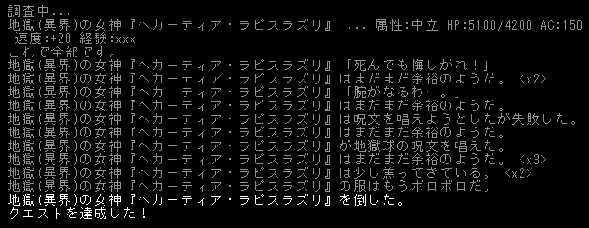 もう会うことは無いかもしれないのでログをキャプチャする。好戦的なセリフを喋るキャラですね。加速の値で勝っていたから変な魔法を使われる前に撃破できたよ。