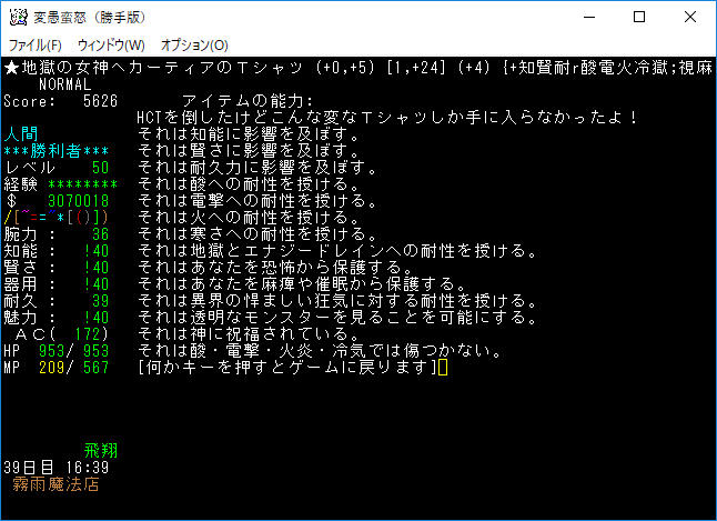 へカーティアがドロップしたTシャツを拾って地上へ帰還。消費した物資は魔力復活の薬だけです。やばくなったら*破壊*や帰還ができるのは気持ちに余裕ができるから嬉しい。