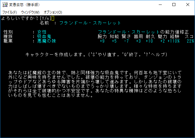 プレイキャラは妹様にしようかな。フランドールはアットウィキにて強いと評価されているキャラクターです。魔法書の破壊や武器の劣化など癖が強いため姉のレミリアよりは扱いづらいとされている。