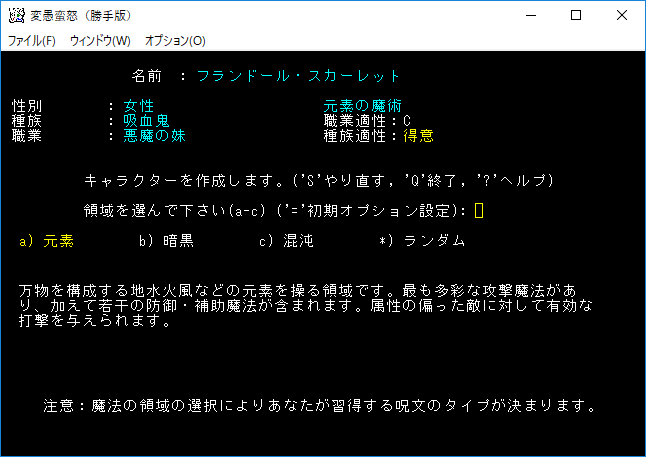アットウィキによると元素の領域を選択すれば防御力が安定するそうです。性格を狂気にするからまともに魔法を使えるかは不明です。