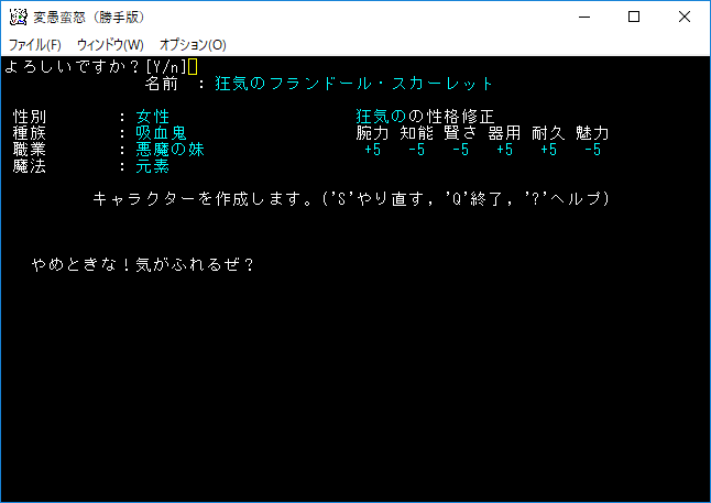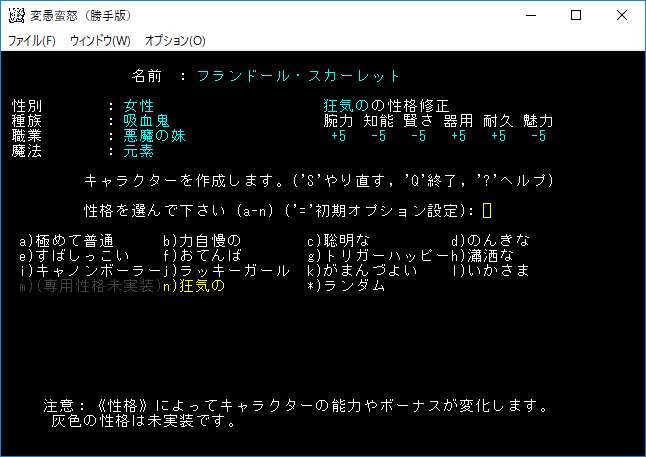 性格は『狂気の』を選択します。狂気のキャラクターはつねに狂乱状態になるらしい。なんのクラスを選ぼうとも無理やり狂戦士にしちゃうわけですね。