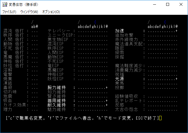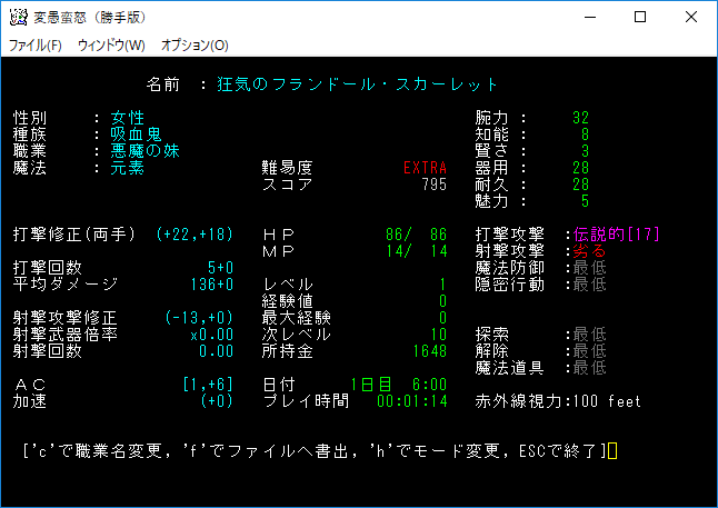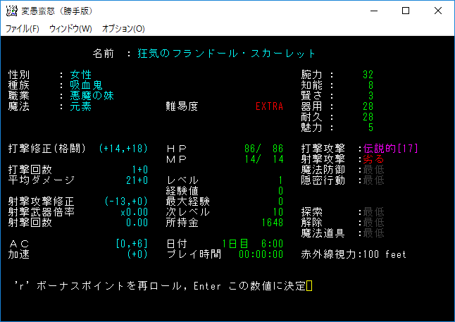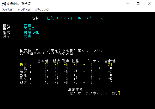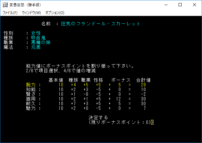 ボーナスポイントは器用を重点的に上げました。変愚蛮怒は器用さの上昇により攻撃回数が増えます(たしか)。魔法を捨てるのなら攻撃回数が増えないとお話にならない。