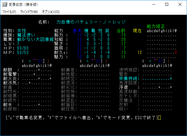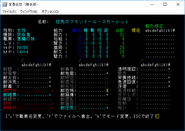 現在の耐性は・・・見なきゃ良かった(泣)。こんなに弱点が多いとはビックリした。しかしながら地獄耐性や暗黒免疫などの長所もある。吸血鬼は影のジャックに瞬殺されません(暗黒の嵐)。