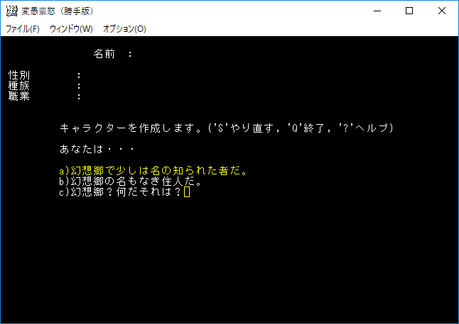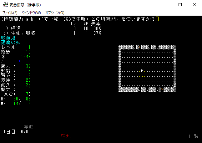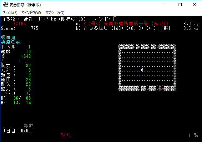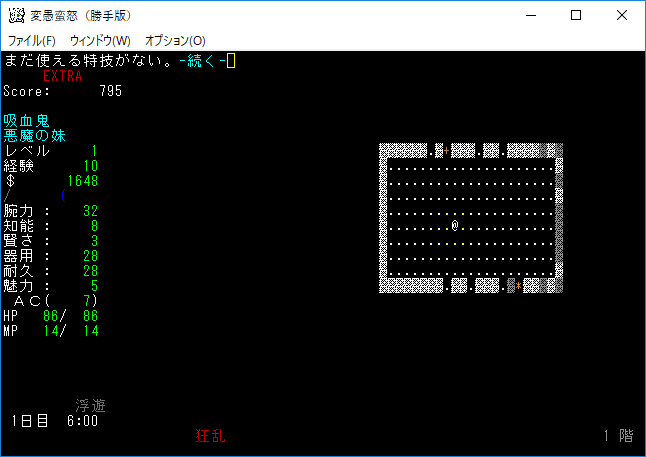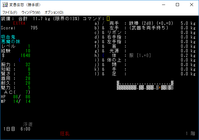 さて、ゲームが始まりました。今回は現状を確認して終わりにしよう。それにしても腕力、器用、耐久の値が高い。こんなにタフなレベル1のキャラは見たことありません。