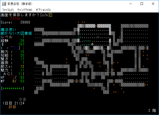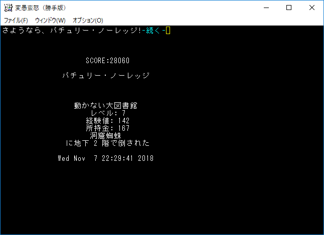 イモムシに気を取られていたらモンスターに囲まれた。大ダメージをくらった後にショート・テレポートの巻物を読むも失敗する。パチュリーはおうちに帰りました。