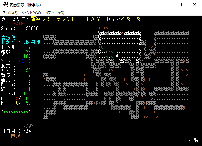 変愚蛮怒東方Project勝手版のプレイ日記を始めます。難易度EXTRAのパチュリー・ノーレッジをプレイ中です。財宝を掘っていたら緑イモムシが増殖しました。サッサとアイテムを回収して地下3階へ降りよう。