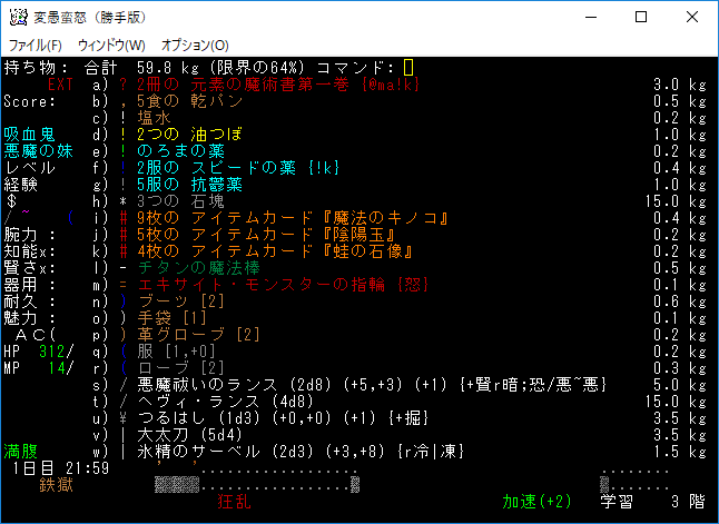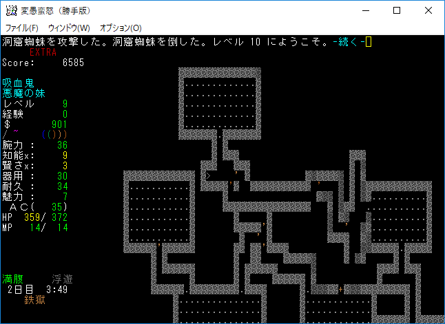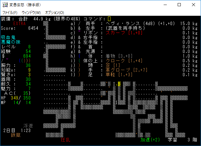 HPを90も減らされたが『ムガッシュ』を撃破。意外にも妹様は柔らかい。AC上昇の技能が無いから防具の確保は急務となる。地下4階の雑魚敵に100ダメージもくらってしまうんだぜ。