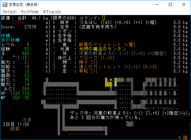 地下4階の探索が終わりました。現在の持ち物は上の画像。ザックの中身が装備品でパンパンだよう。これだけあるとローブとかをぶっ壊したくなる。だけど河童の軟革よろいの例もあるしなあ。