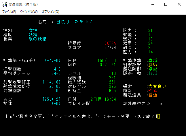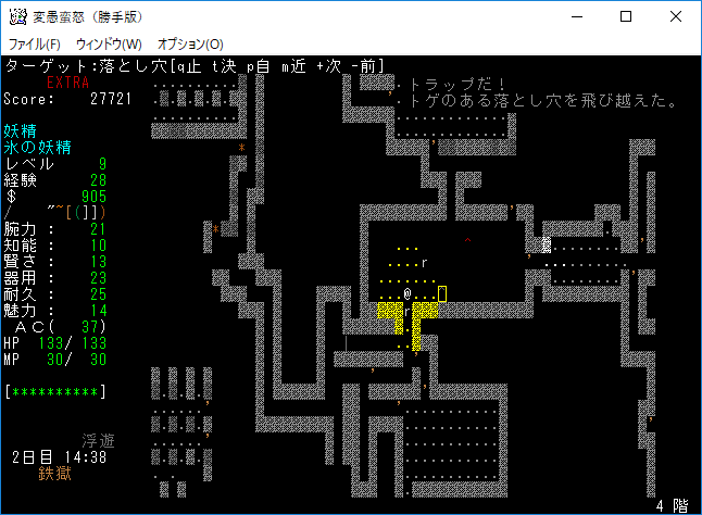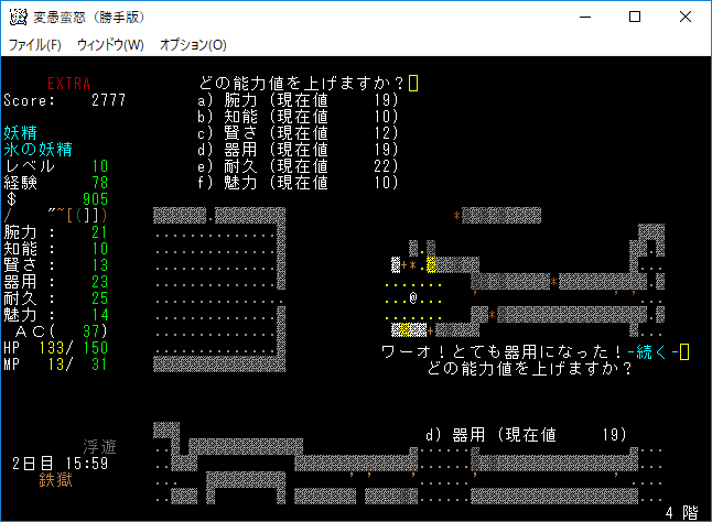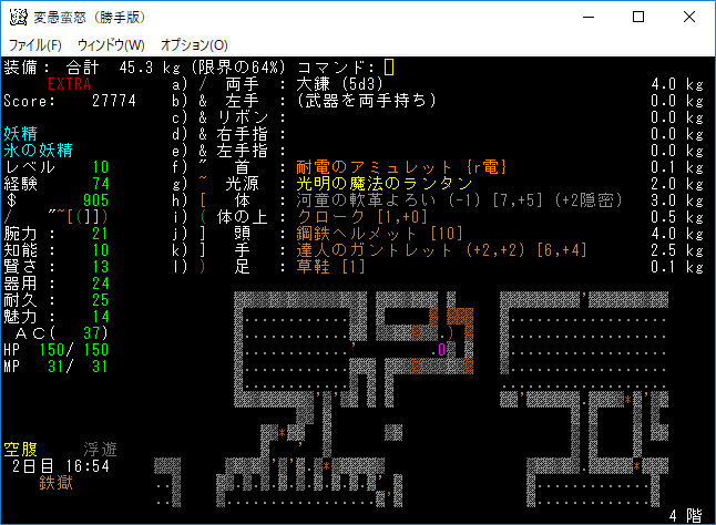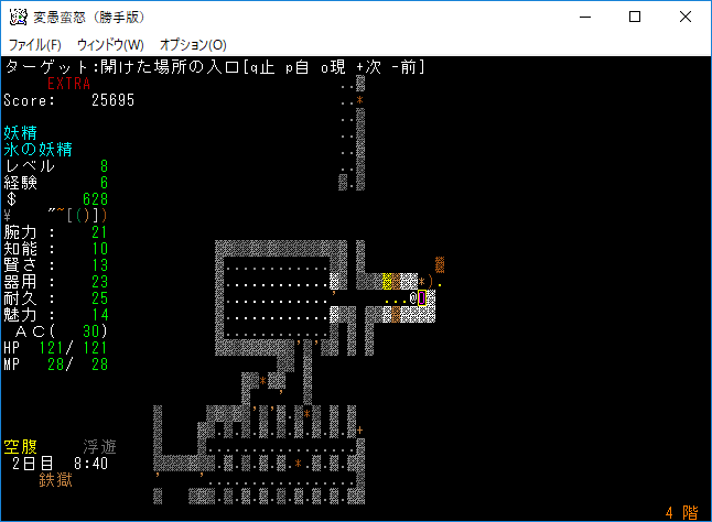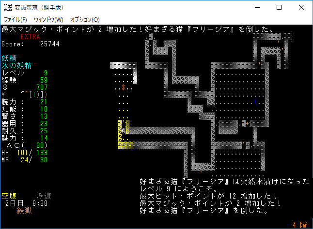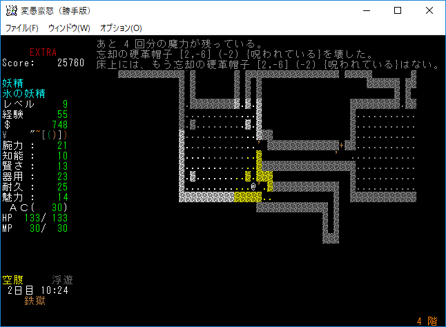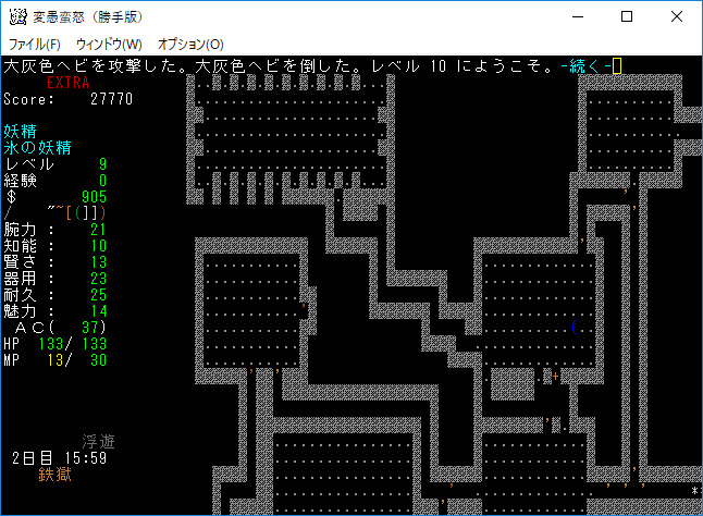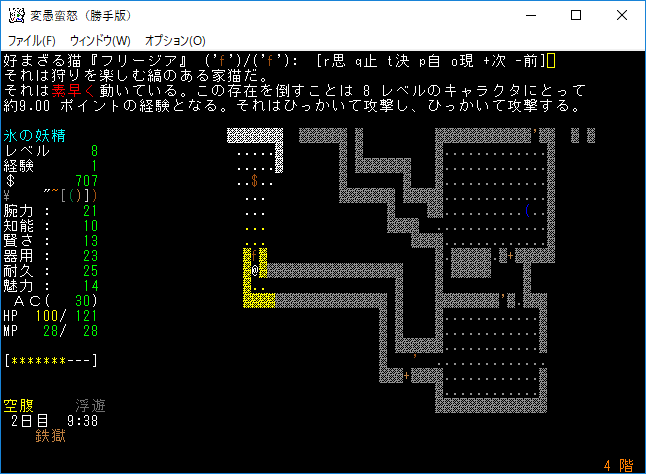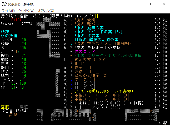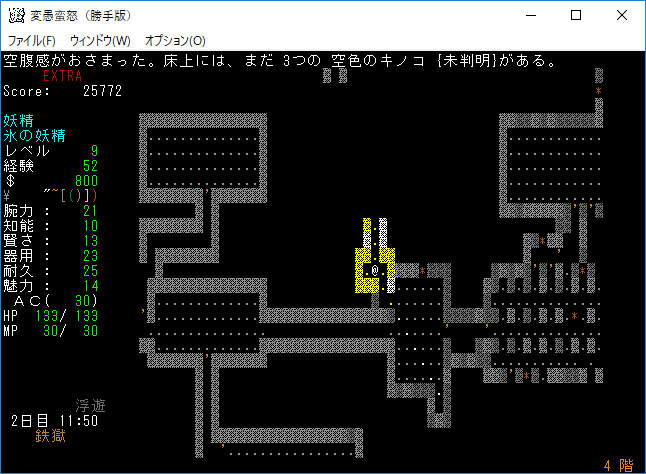 雑魚をぶっ倒してレベルが10になりました。空腹やアイテムの取捨選択がプレッシャーになって胃が痛い。余計なことに神経を使っているとコロッと倒されちゃうから気をつけないとね。