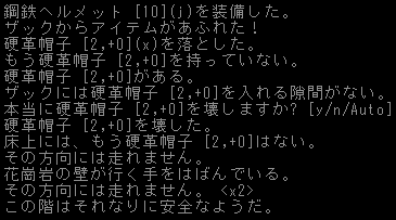 鑑定の杖の使用回数が0になってしまう。持ちきれない装備は身につけることにします。鋼鉄のヘルメットを拾ったら階層の雰囲気が安全になりました。おそらく高級品の兜だろう。