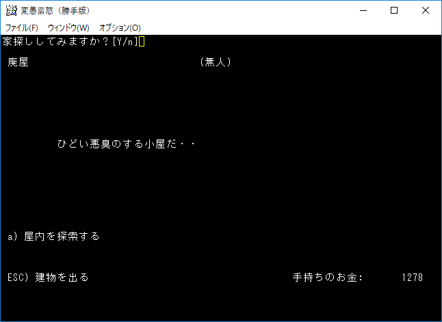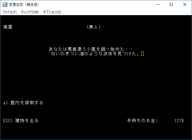 廃屋に入って『a』を押すと酷い悪臭がしました。ここはオークの廃屋みたいですね(wiki)。ランダムで食料、高級品の鎖帷子、酒、etcのどれかを入手できるらしい。
