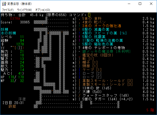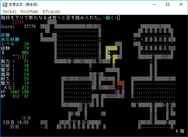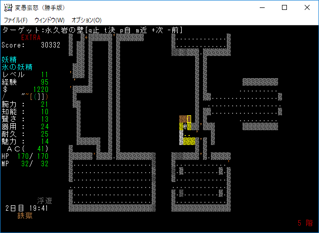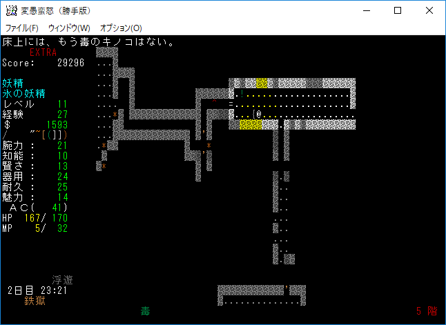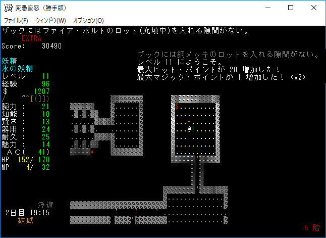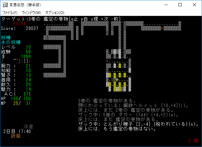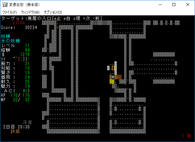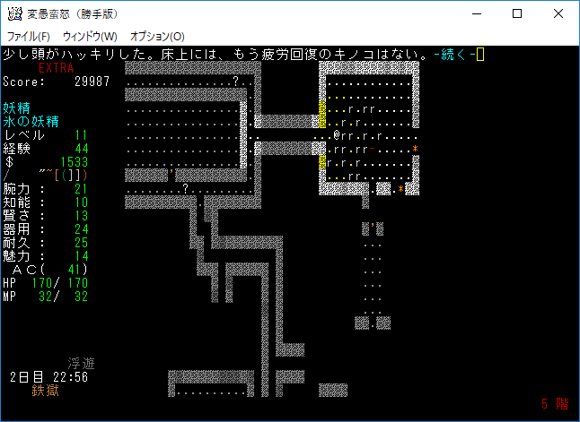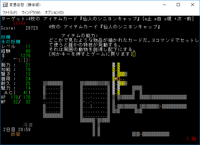 変愚蛮怒東方Project勝手版のプレイ日記を始めます。難易度EXTRAの日焼けしたチルノをプレイ中です。EXTRAはパンパンになったザックをどう扱うかが見所の1つだと思う。現在はショボそうな装備でパンパンになっており泣きそうです。