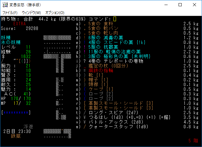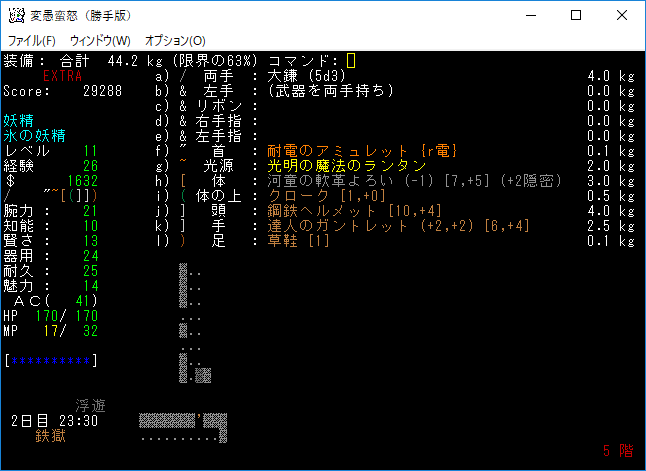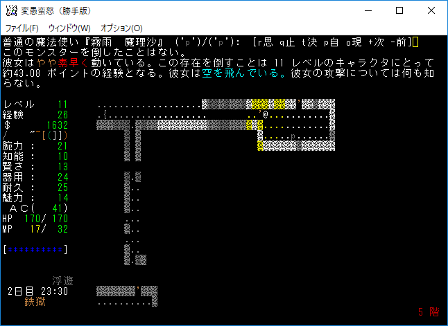 魔理沙と出会ったところでゲームを中退します。魔理沙は冷気耐性を持っているから上手く立ち回る必殺がある。現在の装備は上の画像。期待をしていた鋼鉄のヘルメットは上質でした。