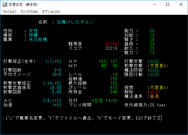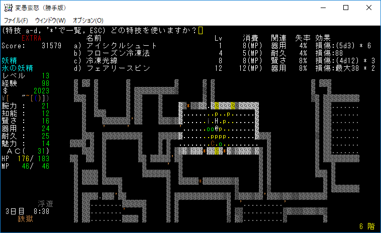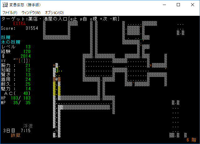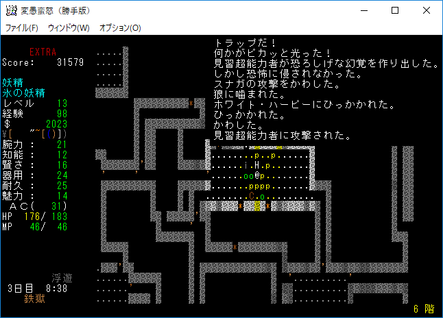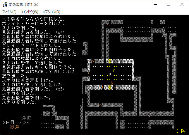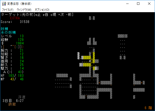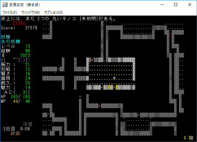 変愚蛮怒東方Project勝手版のプレイ日記を始めます。難易度EXTRAの日焼けしたチルノをプレイ中です。現在は地下6階を探索しております。発見したアイテムは放置してひたすら6階の施設を探し続けている。フロアのアイテムをどうするか考えるのは施設の正体を知ってからだ。